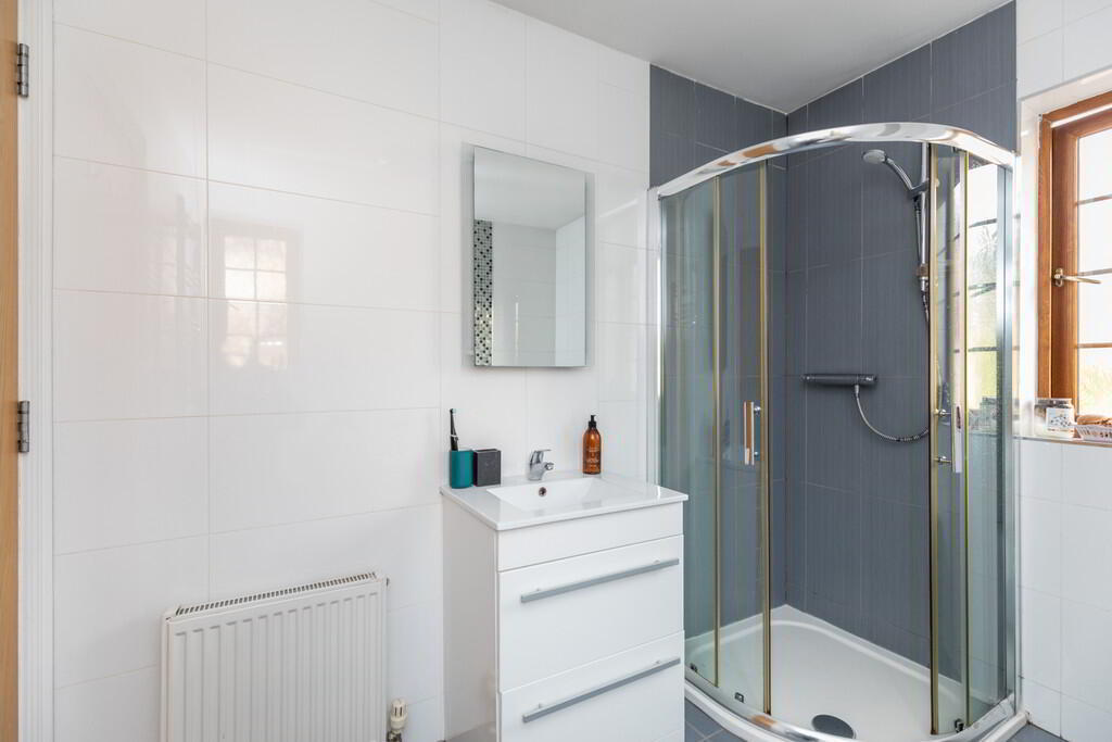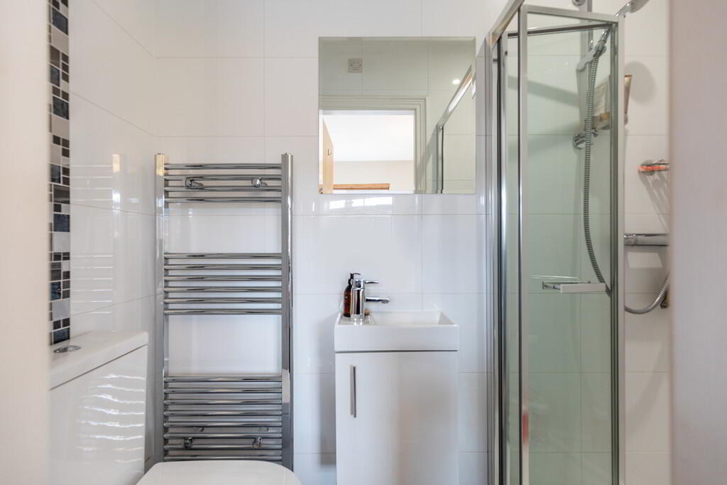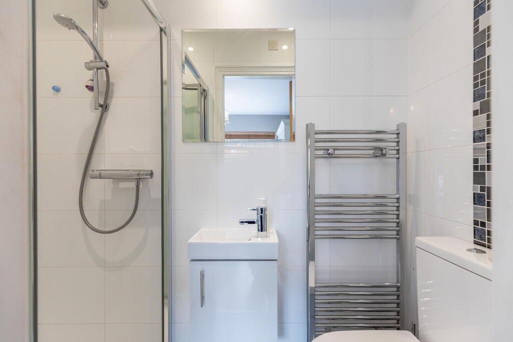 ENSUITE Enclosed shower cubicle, vanity wash hand basin, low flush WC, tiled floor, stainless steel towel radiator, tiled walls, recessed low voltage spotlights, extractor fan.