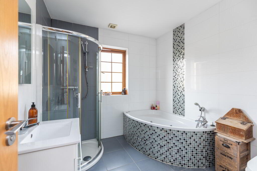 BATHROOM Corner bath with hand shower and Jacuzzi, enclosed shower cubicle, vanity wash hand basin, low flush WC, stainless steel towel radiator, tiled floor, tiled walls, extractor fan.