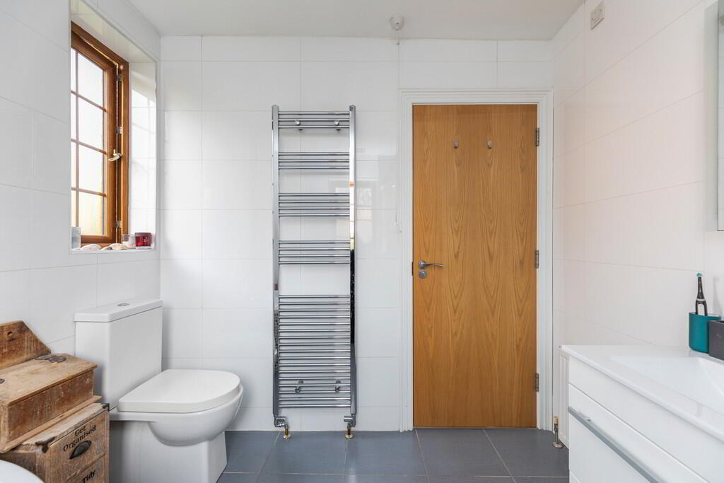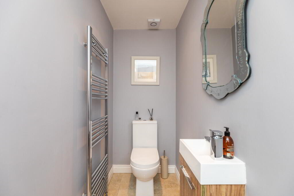 WC Low flush WC, vanity wash hand basin, stainless steel towel radiator, extractor fan, recessed low voltage spotlights, tiled floor.