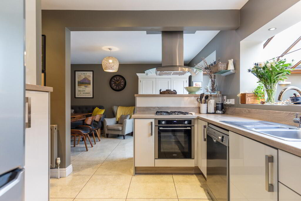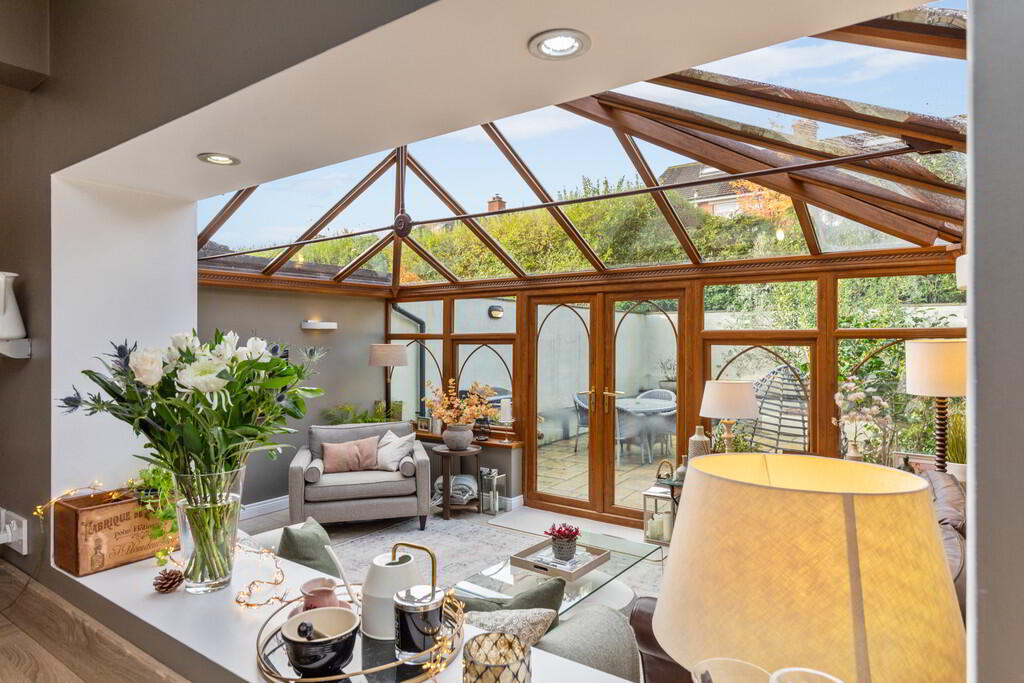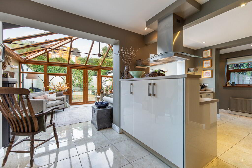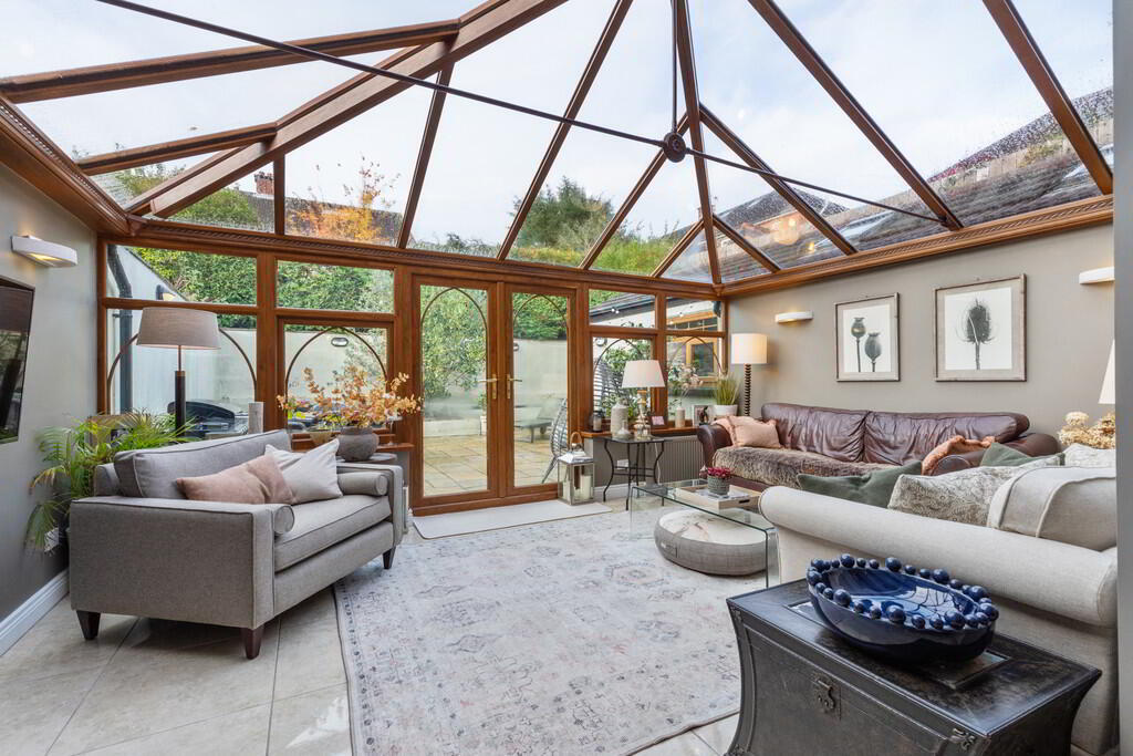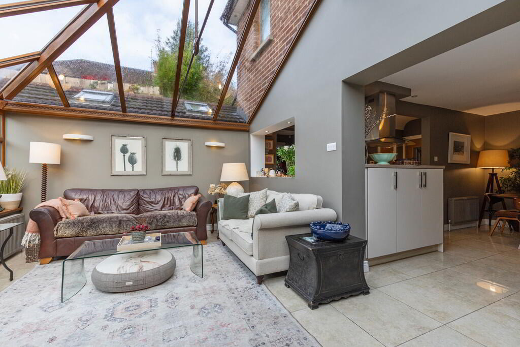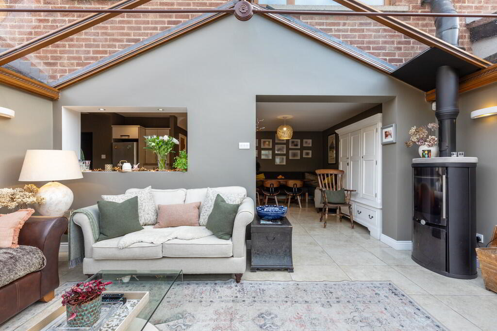 The heart of the home is an impressive open plan living space where the kitchen seamlessly flows into the dining and living areas, creating an ideal environment for both entertaining and everyday family life. The contemporary fitted kitchen features sleek cabinetry, high quality work surfaces, and a full range of integrated appliances. A feature wood burning stove in the adjoining conservatory adds a warm and welcoming focal point, enhancing the atmosphere of this stylish home.