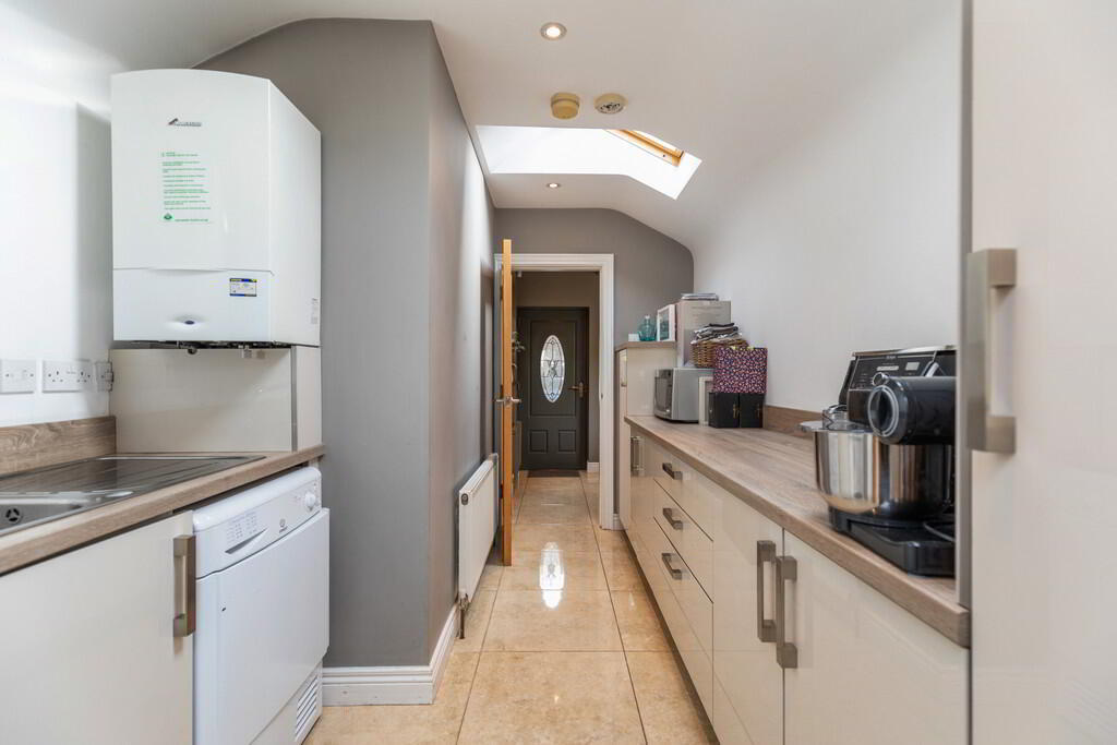 UTILITY ROOM 12' 7" x 8' 0" (3.86m x 2.46m) Range of fitted high and low level units, wood effect work surfaces, single drainer stainless steel sink unit with mixer taps, Worcester gas fired boiler, tiled floor, Velux skylight, recessed low voltage spotlights, plumbed for washing machine, extractor fan, door leading to store room.