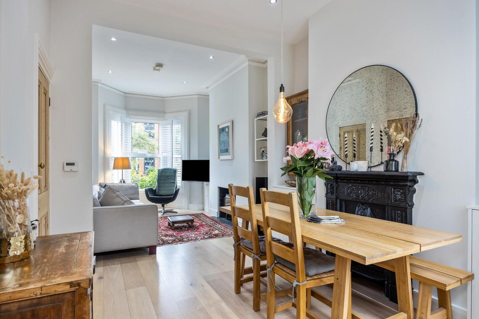 LOUNGE 24' 6" x 10' 4" (7.479m x 3.17m) (including Dining Room) Engineered timber flooring, feature glass fronted cast iron stove with slate tiled hearth, low voltage spotlights, cornice ceiling, bay window.