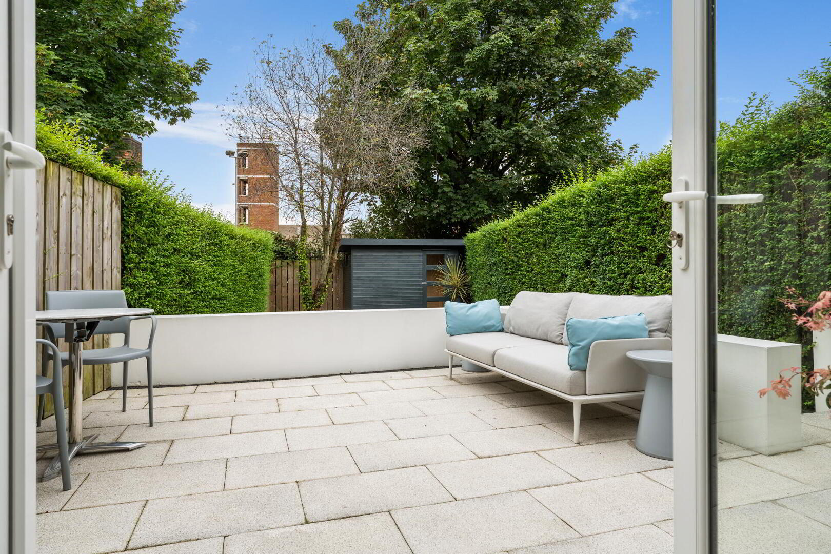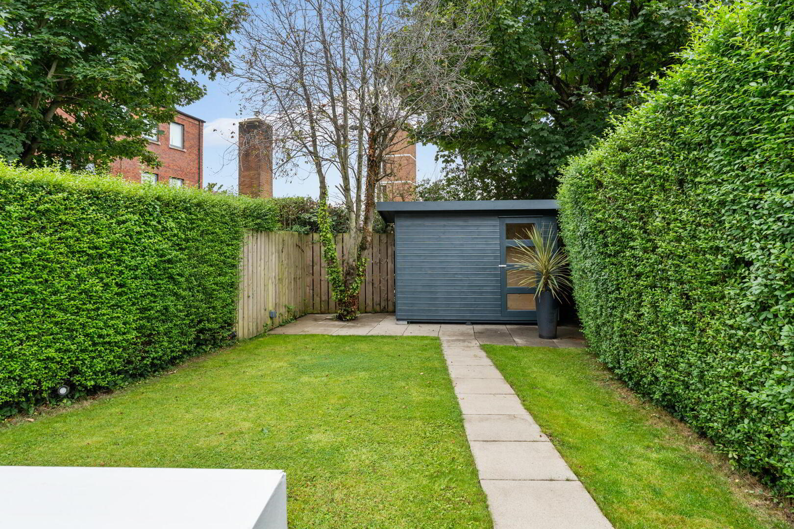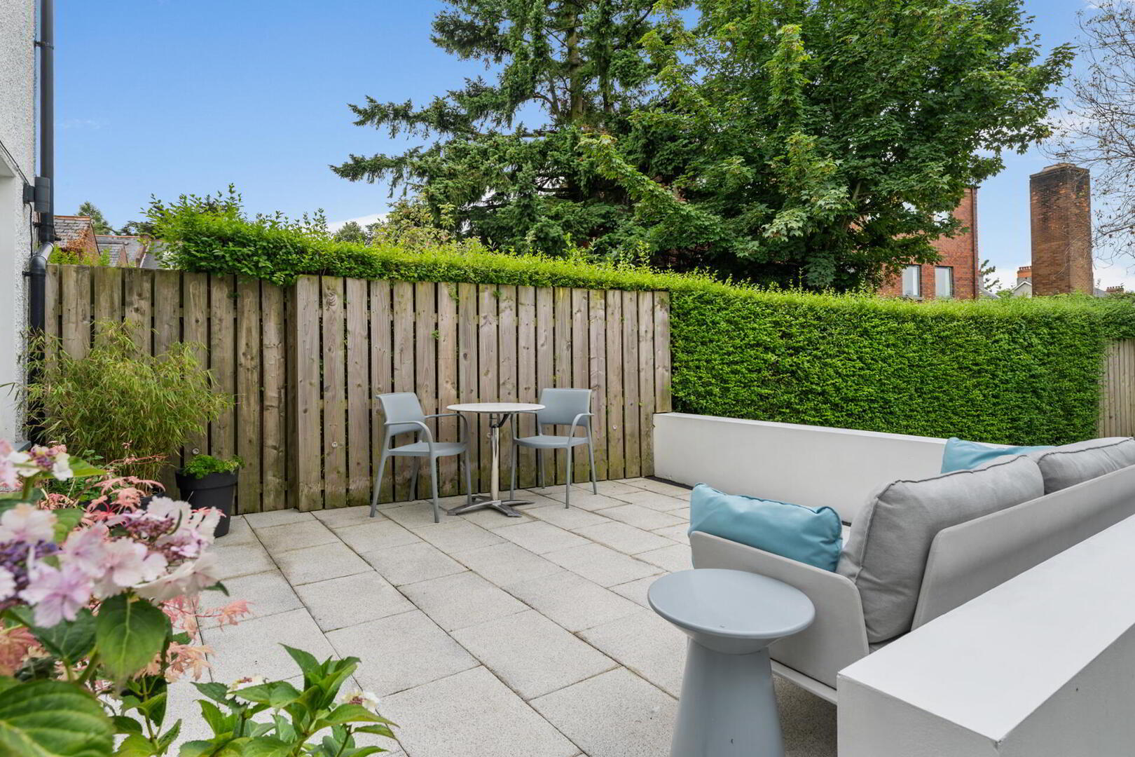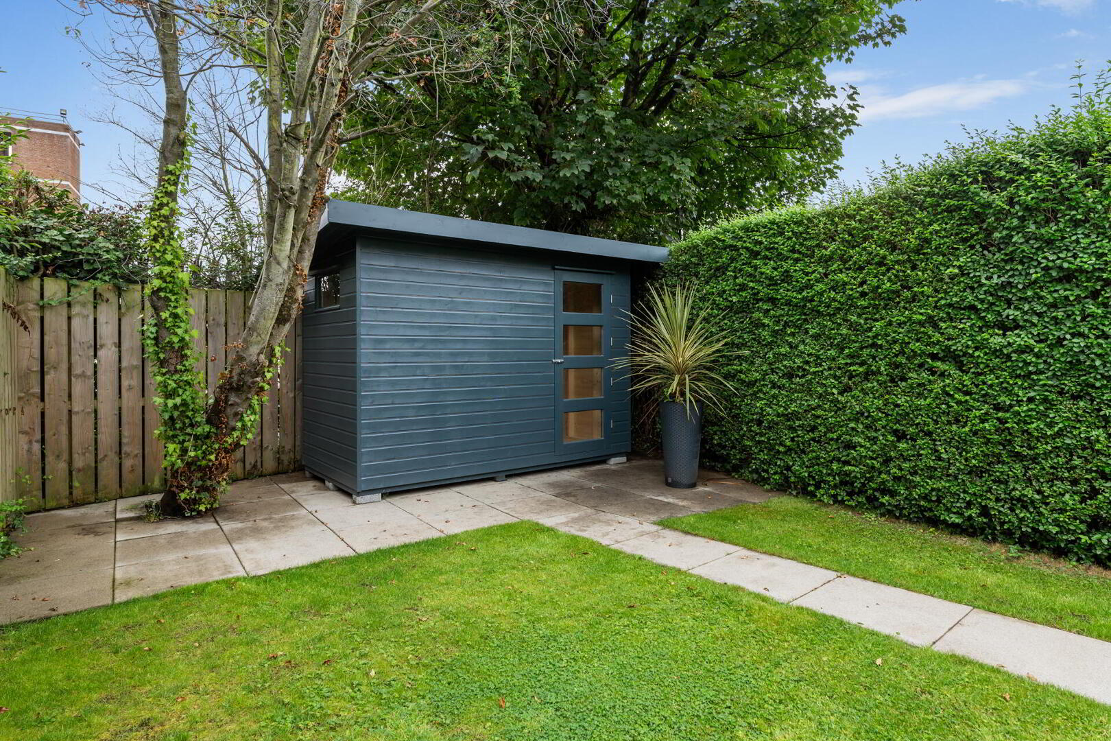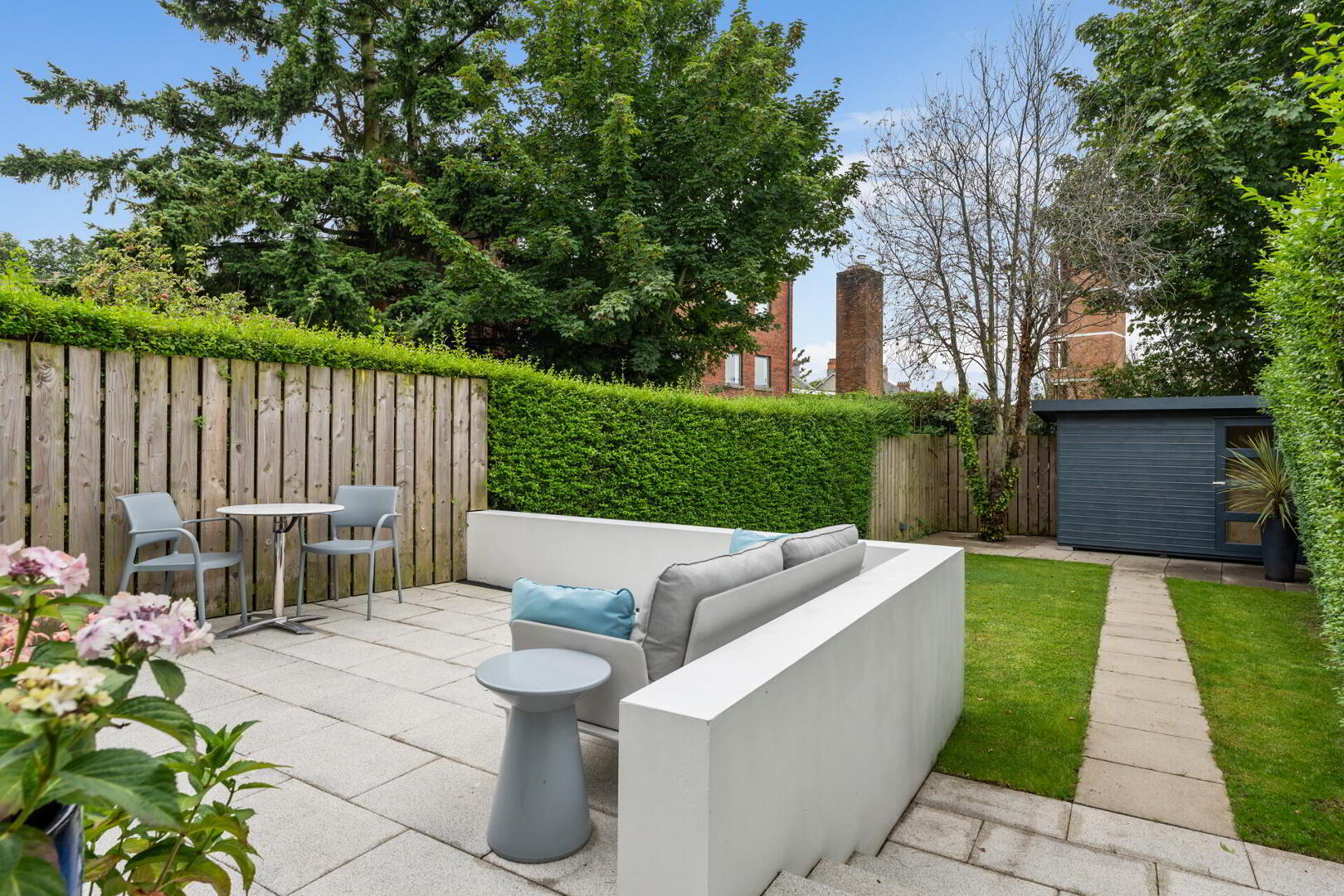 Private, enclosed rear garden laid in lawn with raised patio area with a Tobermore paviour finish, mature hedges and shrubs, timber fencing, outside light.