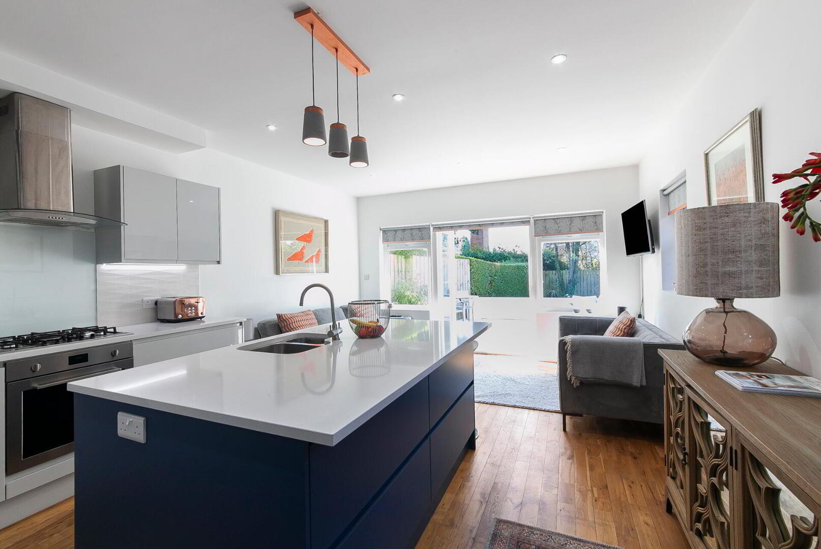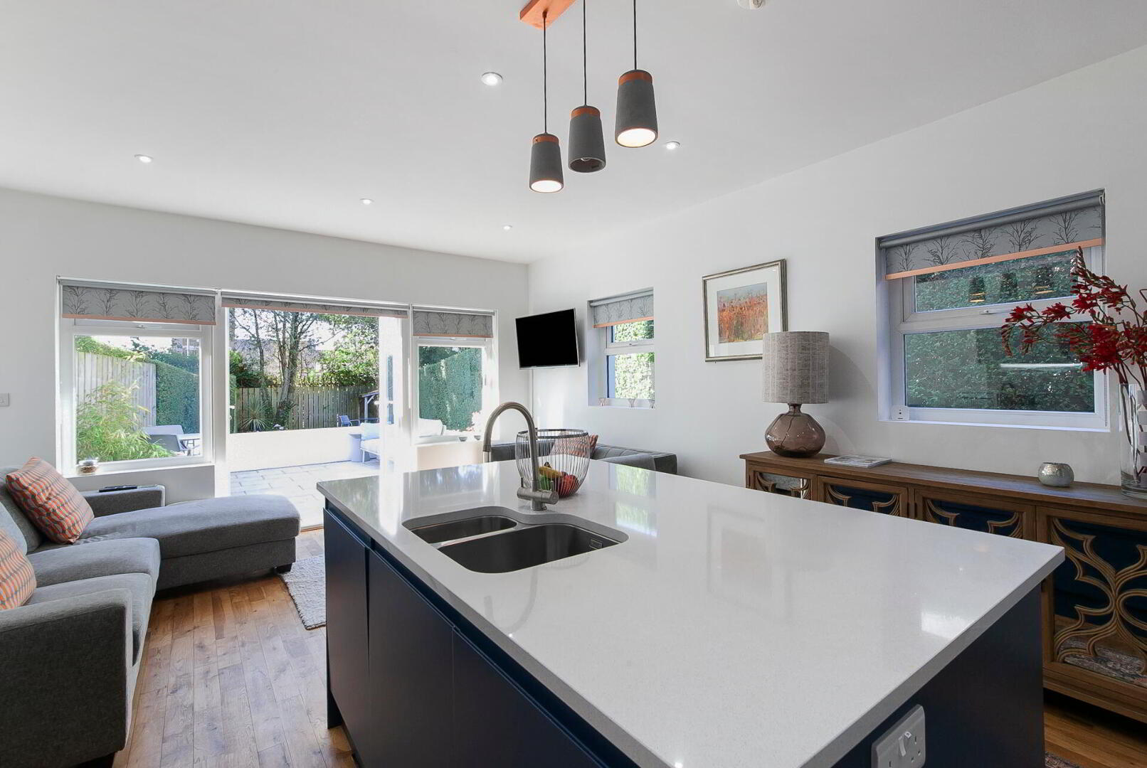 Feature island unit with Silestone work surfaces, storage under, breakfast bar, Franke sink unit with chrome mixer tap, integrated Bosch dishwasher.