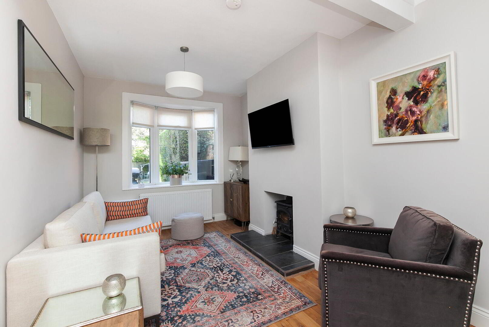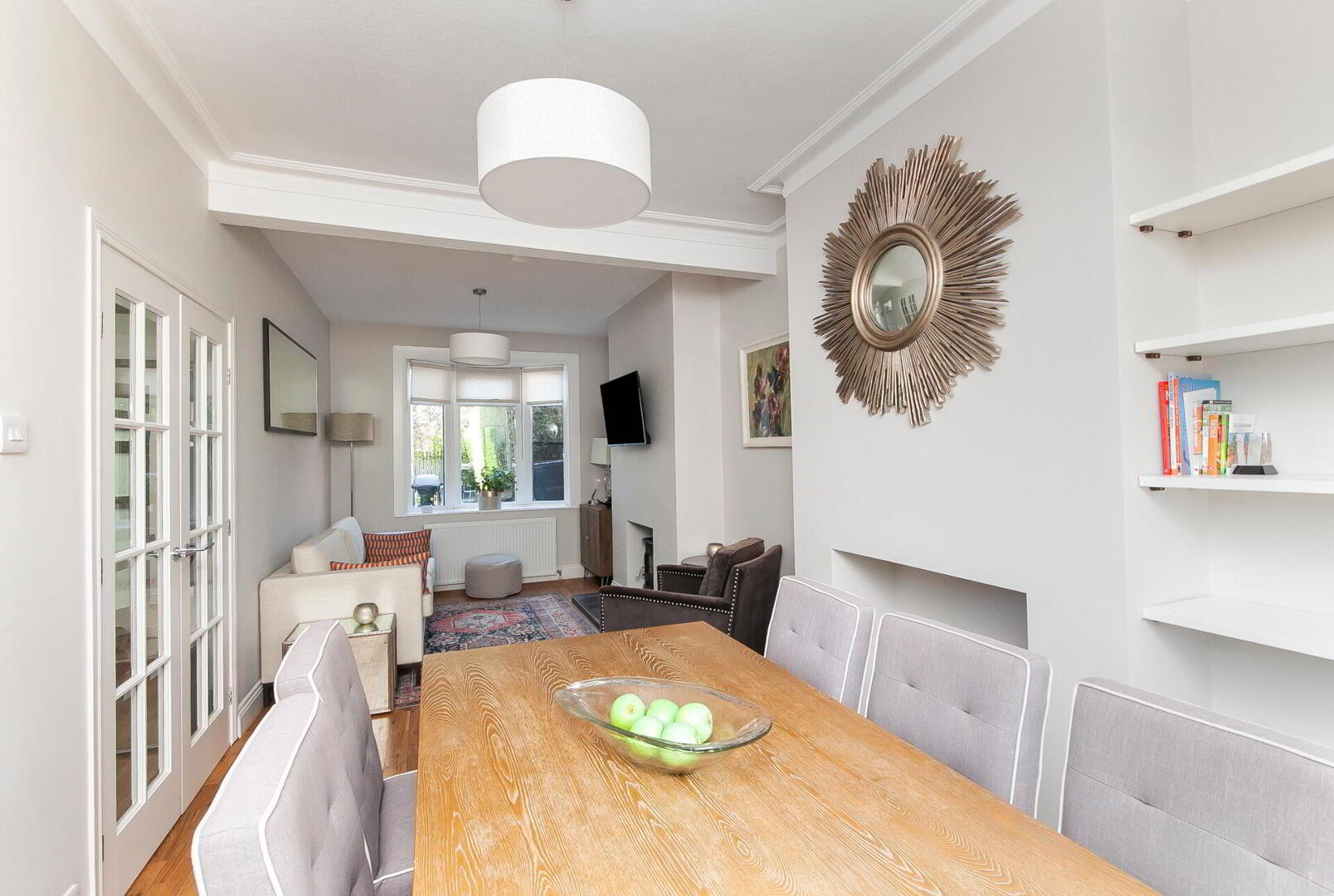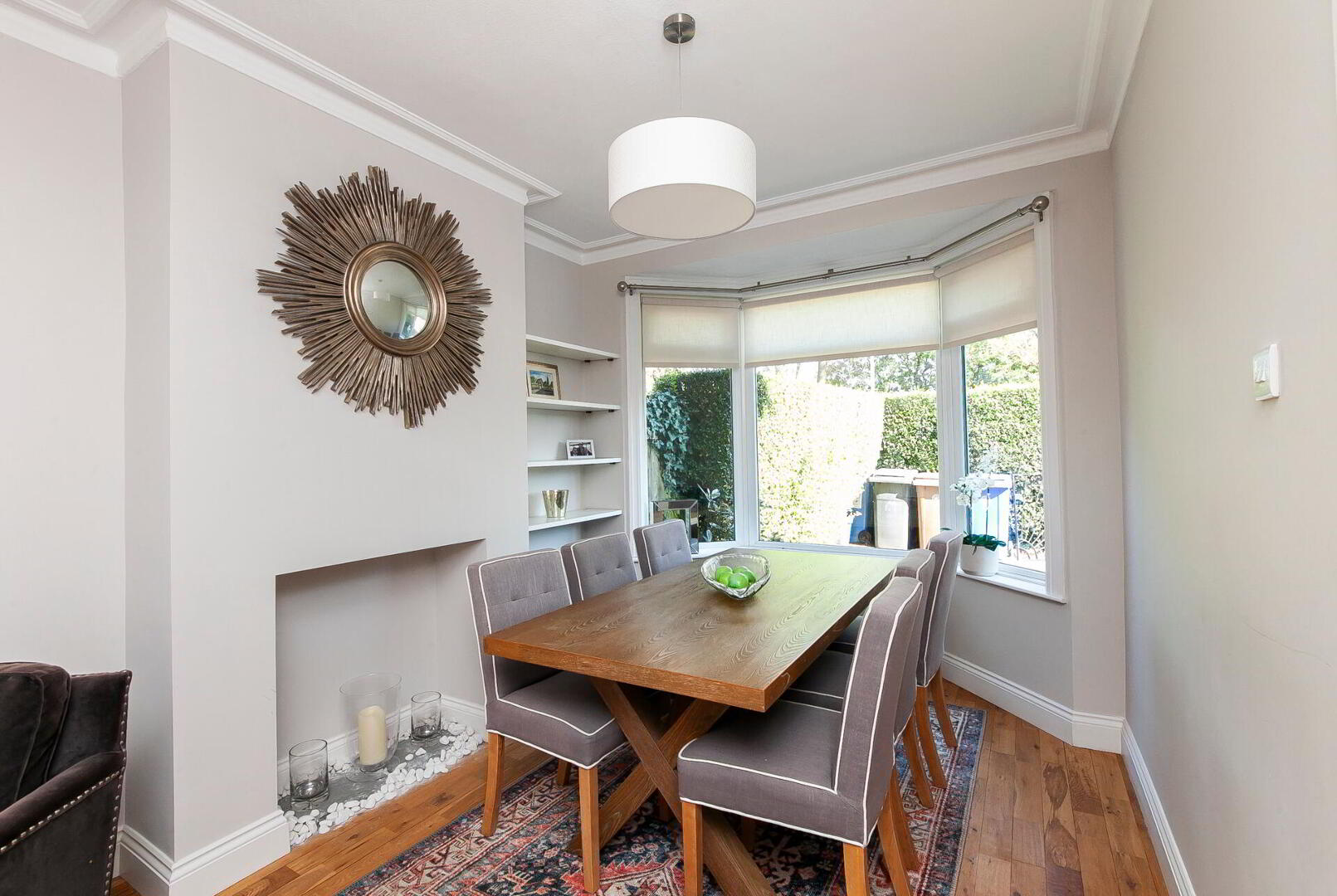 LIVING AND DINING ROOM 22' 8" x 9' 4" (6.91m x 2.84m) Dual aspect and dual bay windows, feature wood burning stove with tiled hearth, display shelving, cornicing, solid wooden floor