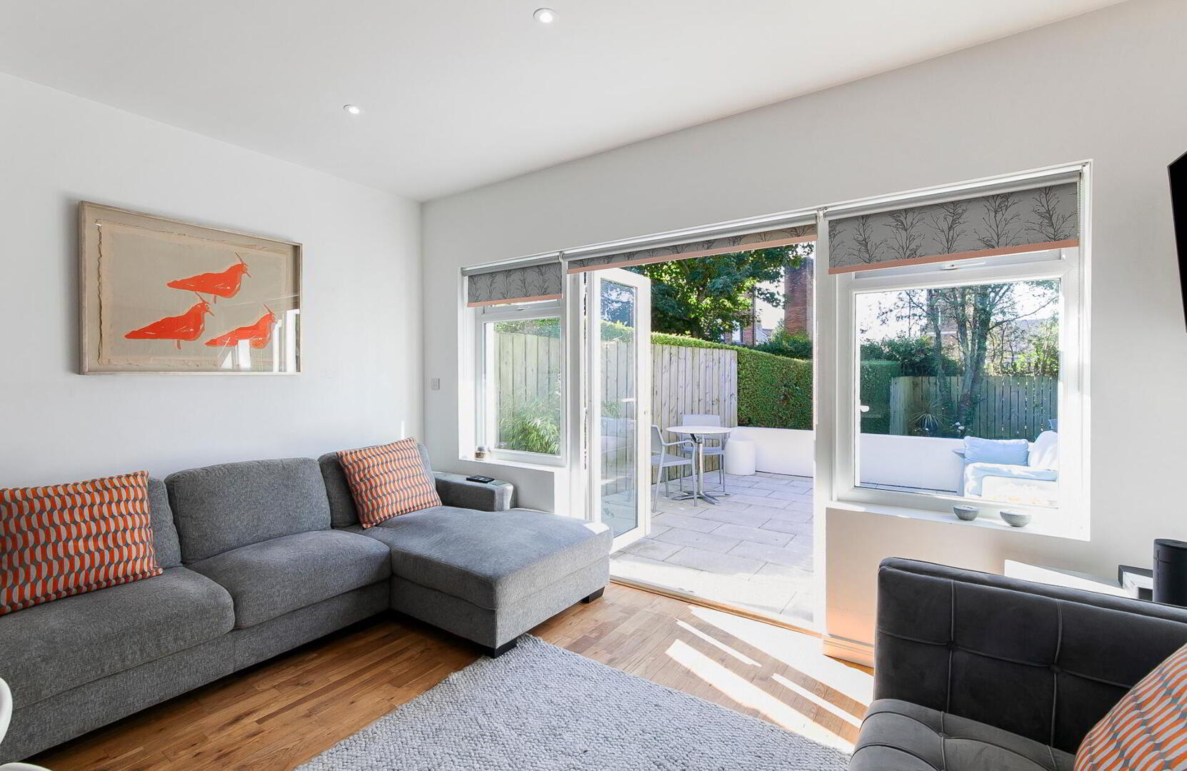 Solid wooden floor, partly tiled walls, spot lighting, double doors to rear garden, uPVC door to side.