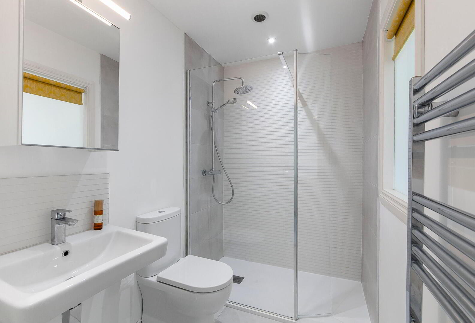 ENSUITE SHOWER ROOM Luxury suite comprising of a fully tiled shower cubicle with rainwater drench style shower, wall hung wash hand basin with chrome taps and tiled splash back, low flush w.c, heated chrome towel radiator, tiled floor, spot lighting