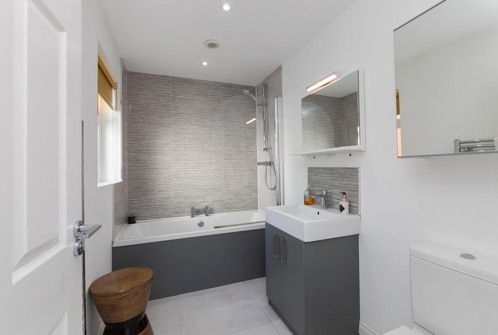 FAMILY BATHROOM Contemporary white suite comprising of a panel bath with chrome taps, wall hung wash hand basin with chrome taps and tiled splash back and storage under, low flush w.c, heated chrome towel radiator, partly tiled walls, tiled floor, spot lighting