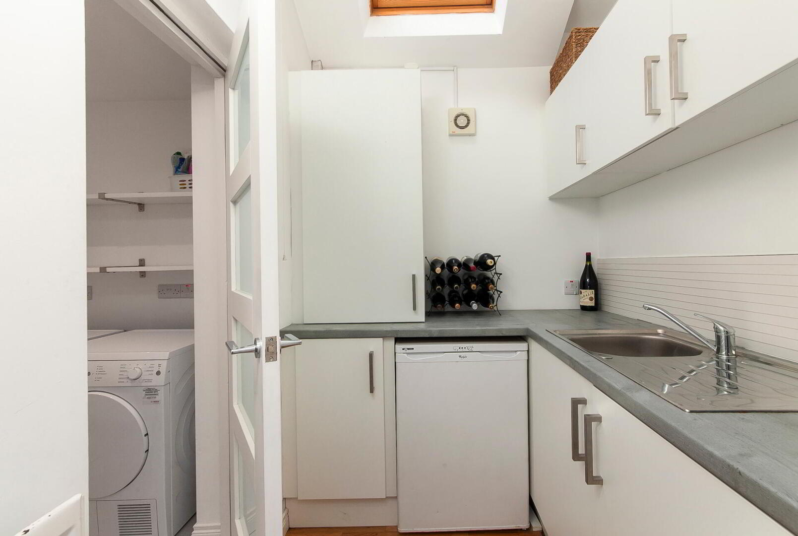 UTILITY ROOM 6' 6" x 5' 8" (2.00m x 1.73m) Range of high and low level units, wood effect work surfaces, stainless steel sink unit with chrome tap, tiled splash back, plumbed for dishwasher, integrated under counter fridge, space for under counter freezer, velux window