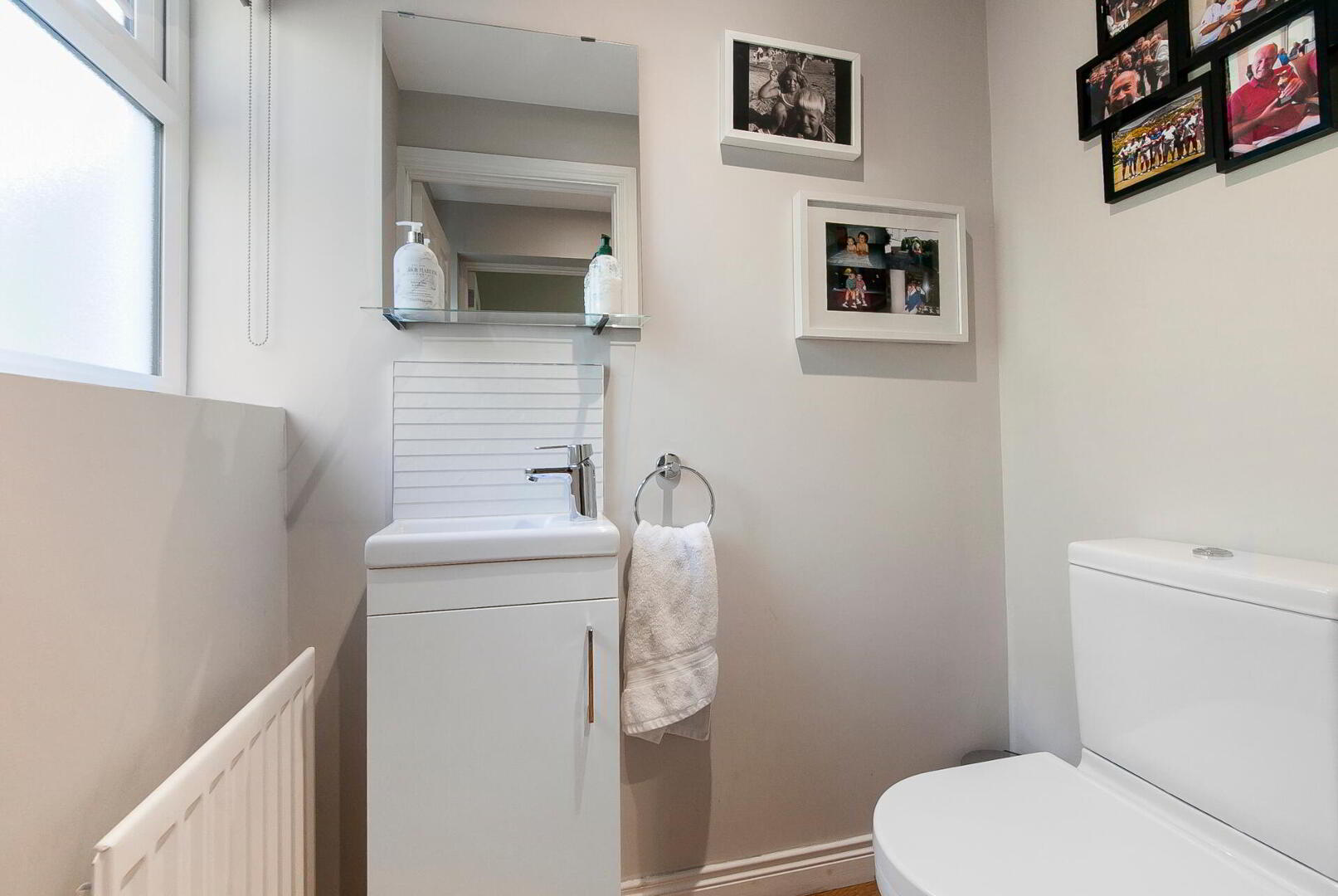 CLOAKROOM & W.C Low flush w.c, wash hand basin with chrome tap and storage under with tiled splash back, wooden floor, spot lighting.