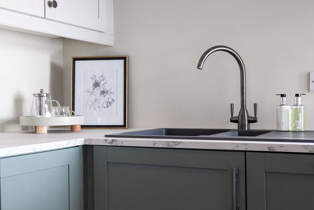 KITCHEN 11' 2" x 6' 3" (3.42m x 1.91m) Recently fitted range of high and low level units with marble effect work surfaces, sink unit with chrome swan mixer tap, integrated Lamona oven and hob with boxed extractor fan over, integrated dishwasher, integrated fridge freezer, display shelving, spot lighting.