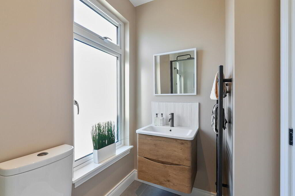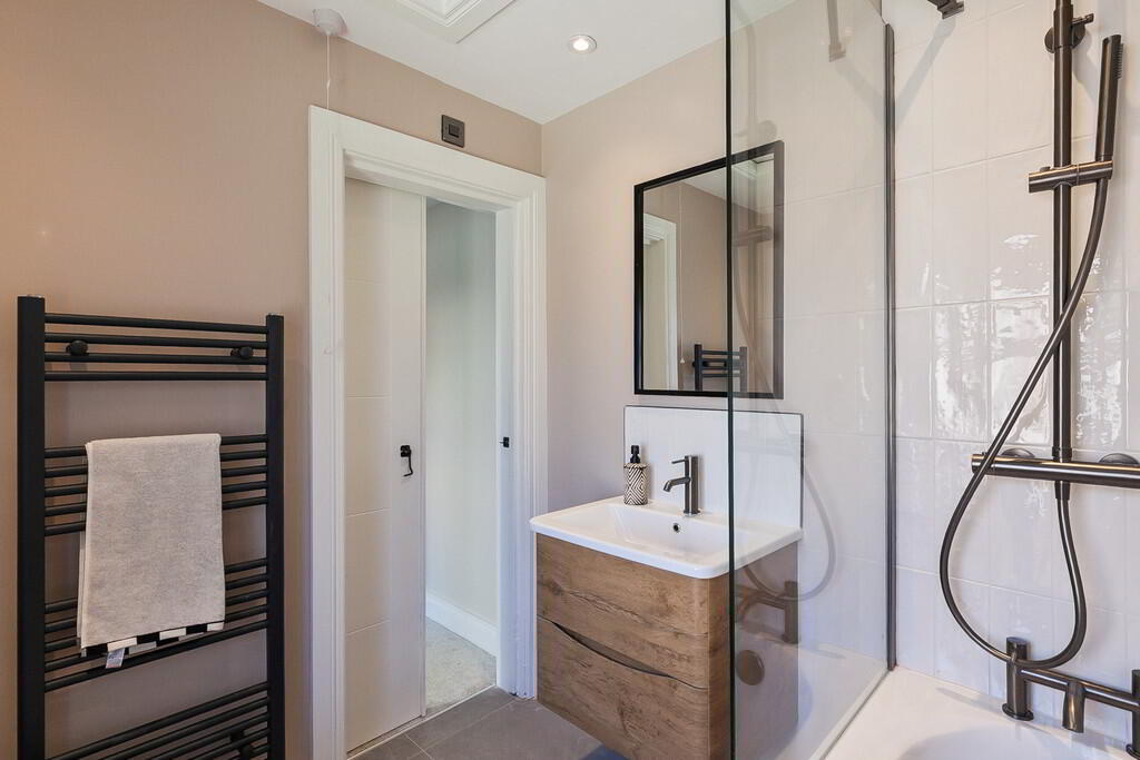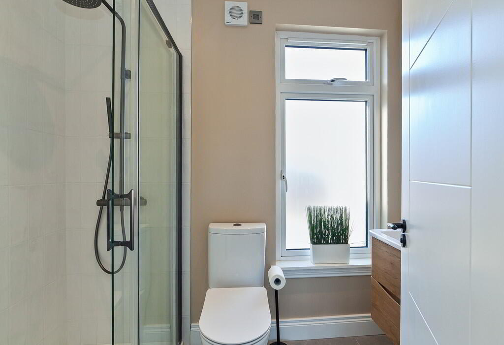 ENSUITE SHOWER ROOM Fully tiled shower cubicle with drench style shower, wall hung wash hand basin with storage under and tiled splash back, low flush w.c, heated vertical towel radiator, tiled floor, partly tiled walls, spot lighting.