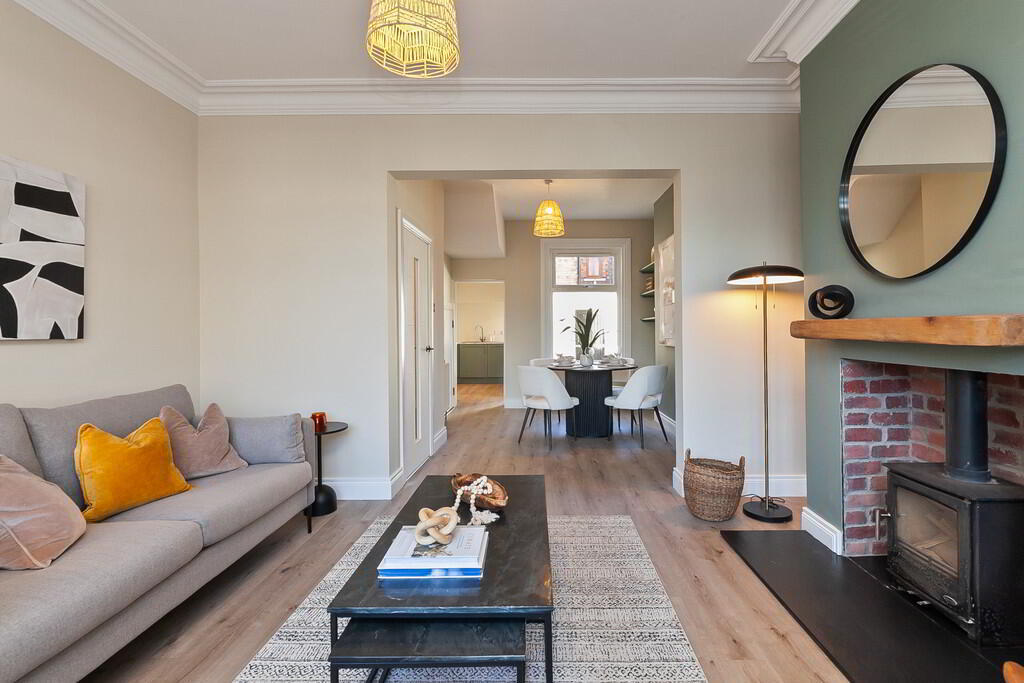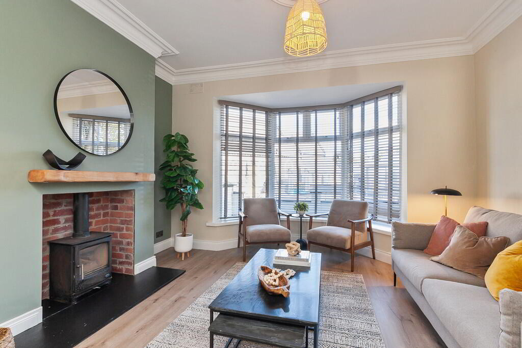 • Bay Fronted Living Room With Stove Open To Dining Room