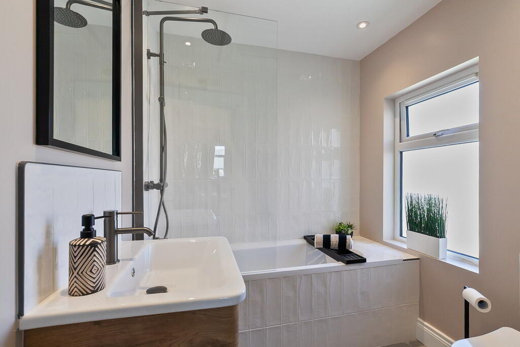 BATHROOM Tiled panel bath with drench style shower, wall hung wash hand basin with tiled splash back, low flush w.c, vertical towel radiator, partly tiled walls, tiled floor. spot lighting.