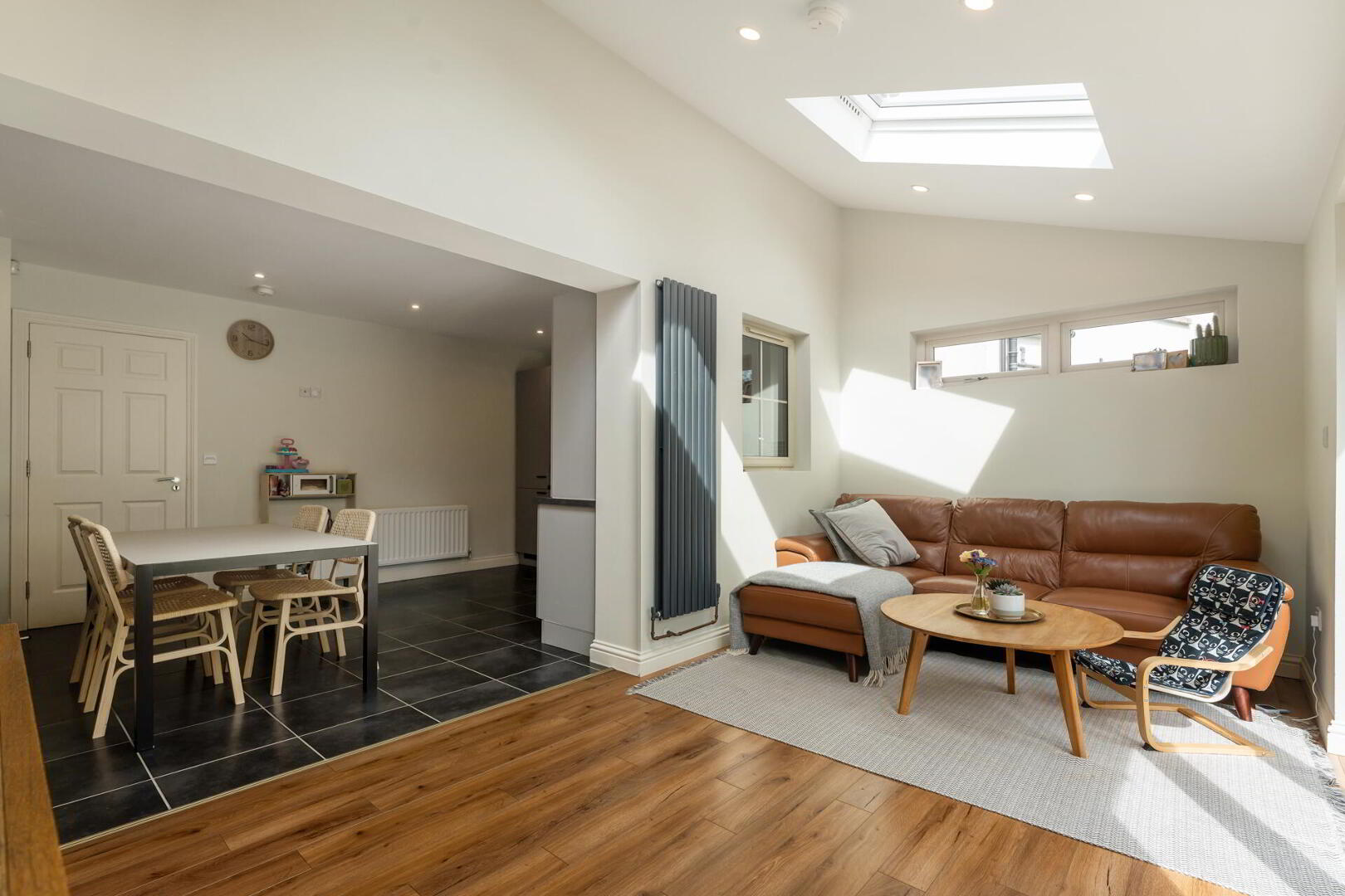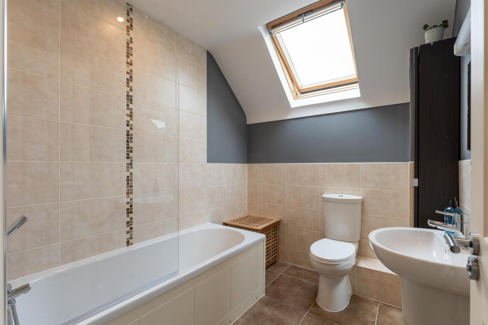 BATHROOM Panel bath with chrome taps, wall hung wash hand basin with chrome taps, low flush w.c, tiled floor, partly tiled floor, velux window.
