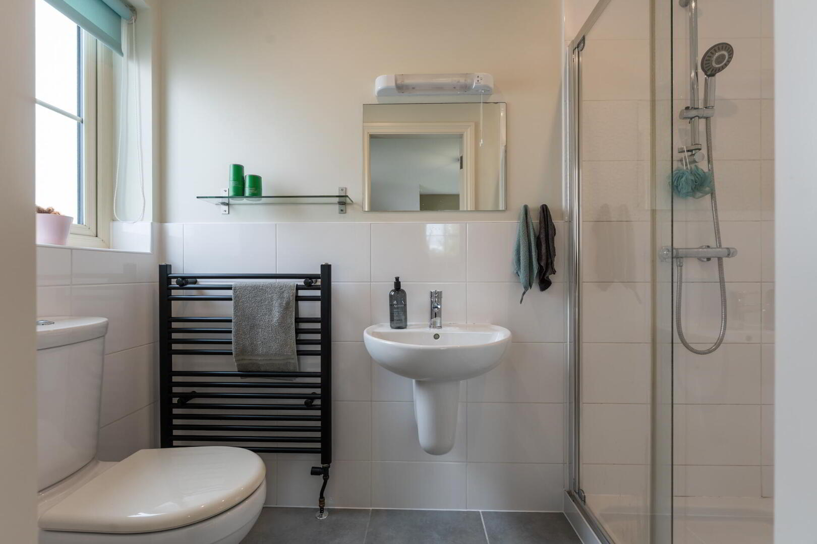 ENSUITE Fully tiled shower cubicle, low flush w.c, wall hung wash hand basin with chrome taps, heated towel radiator, tiled floor, spot lighting