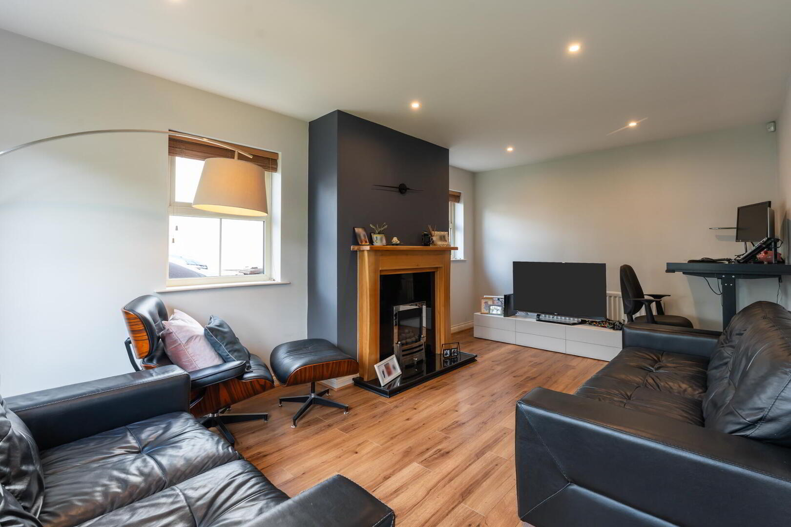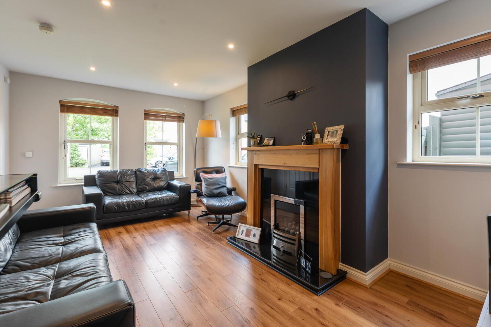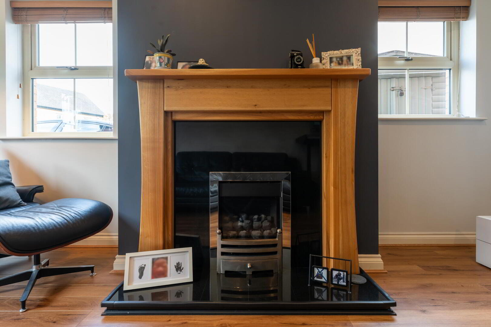 LIVING ROOM 17' 8" x 10' 10" (5.40m x 3.31m) Feature gas fire with granite hearth and wooden mantle, wood strip flooring, spot lighting.