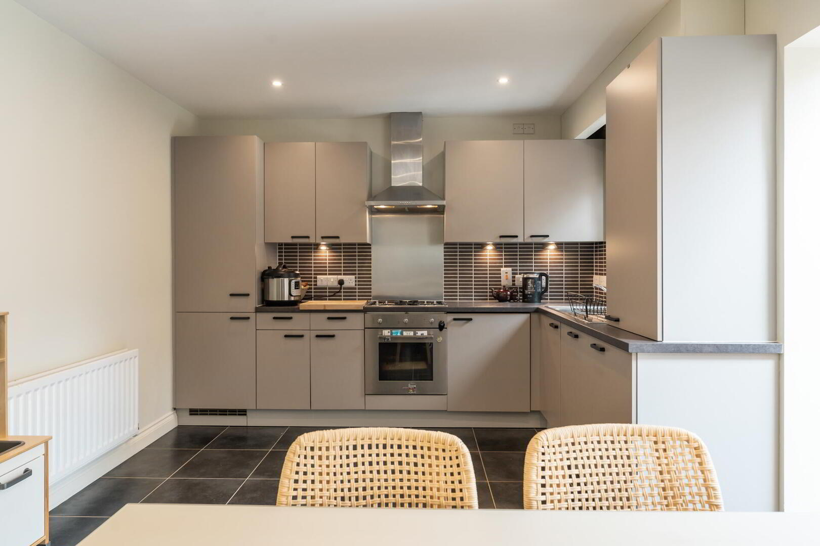 KITCHEN WITH DINING AREA 17' 9" x 10' 9" (5.42m x 3.29m) Excellent range of high and low level units with feature under lighting, formica work surfaces, stainless steel sink unit, integrated oven and four ring gas hob with chrome extractor fan over, integrated dishwasher, integrated fridge freezer, integrated washing machine, partly tiled walls, tiled floor.