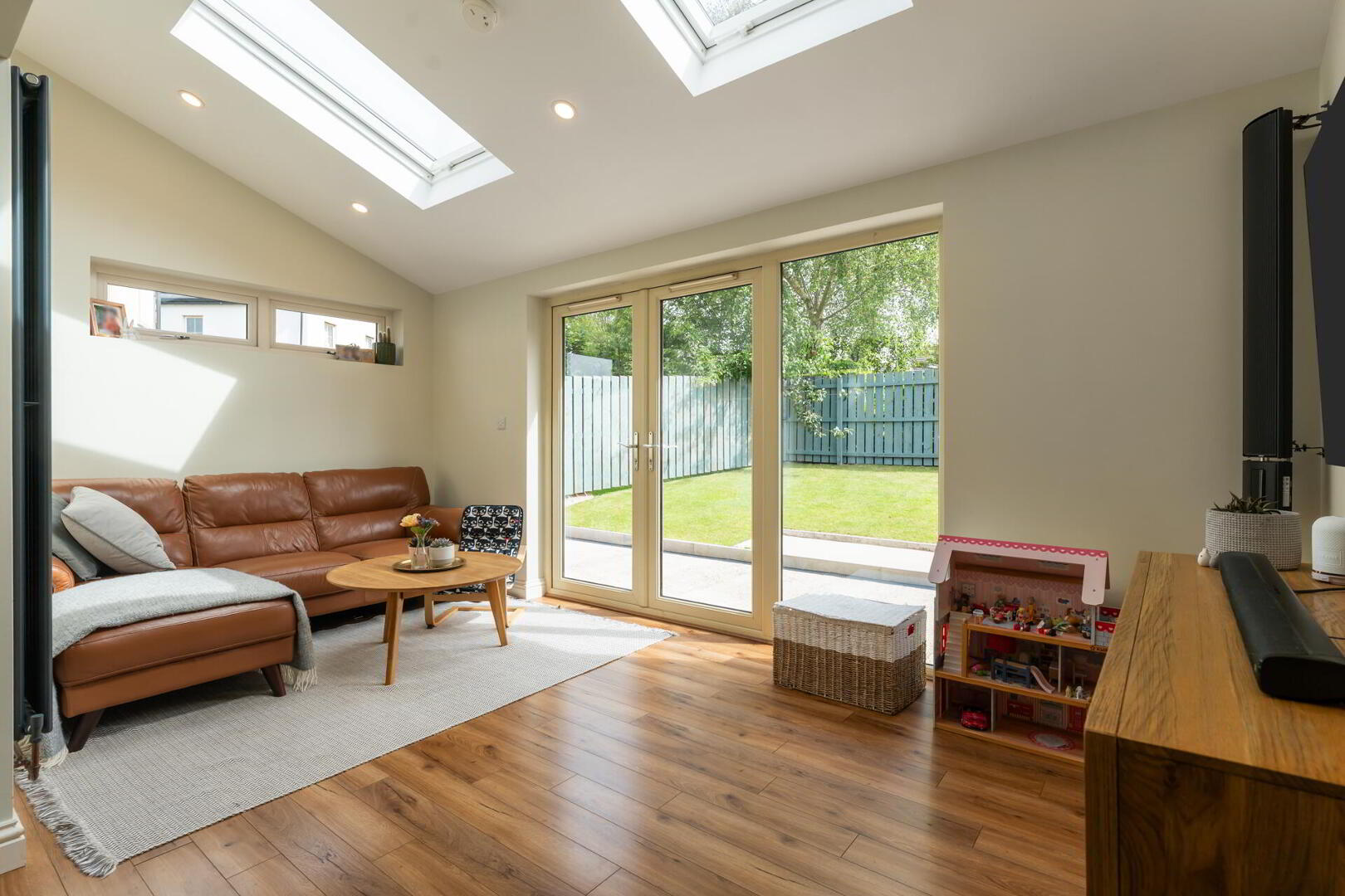 SUN ROOM 16' 5" x 9' 0" (5.02m x 2.75m) Wood strip flooring, velux windows, spot lighting, double doors to rear garden.