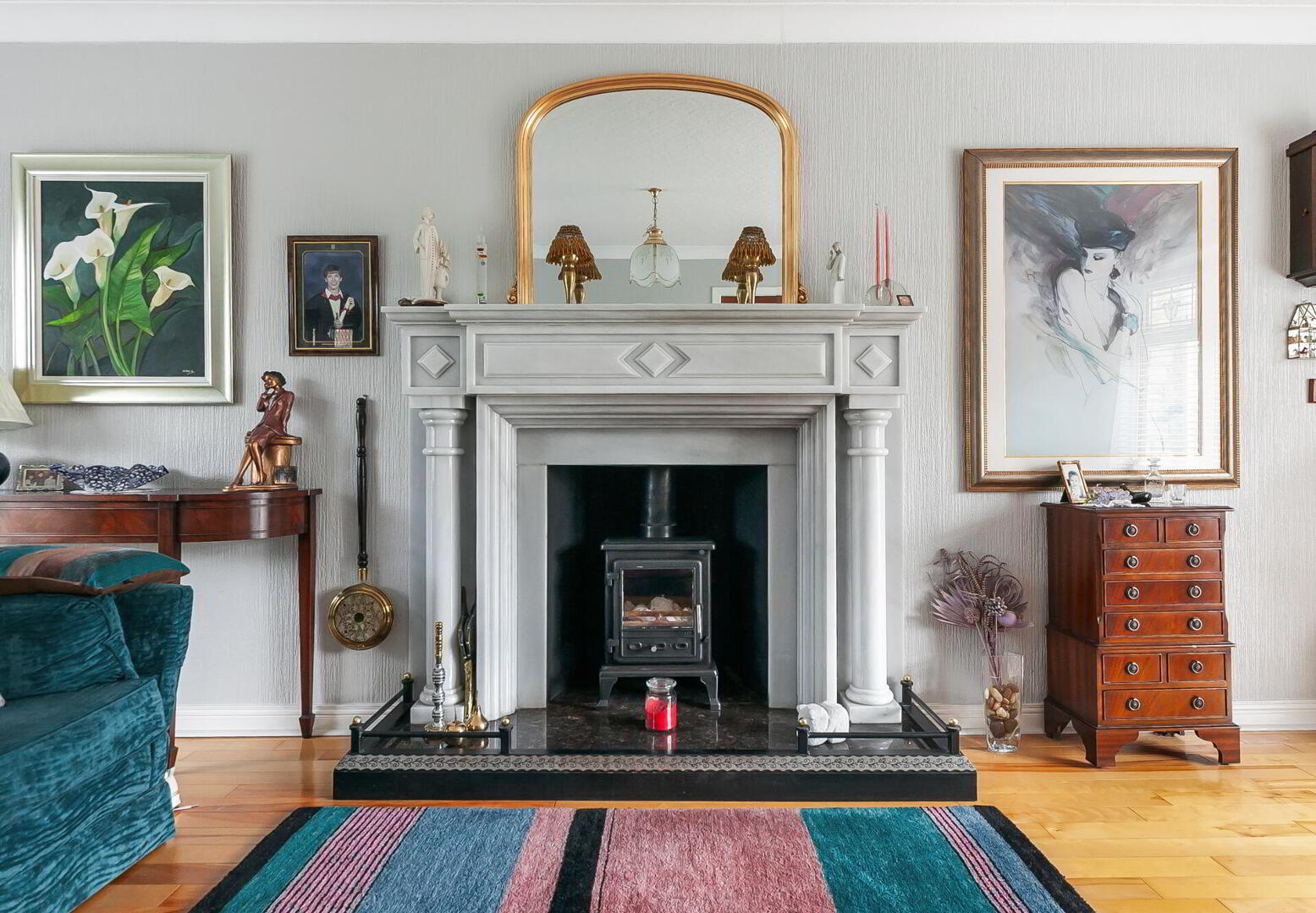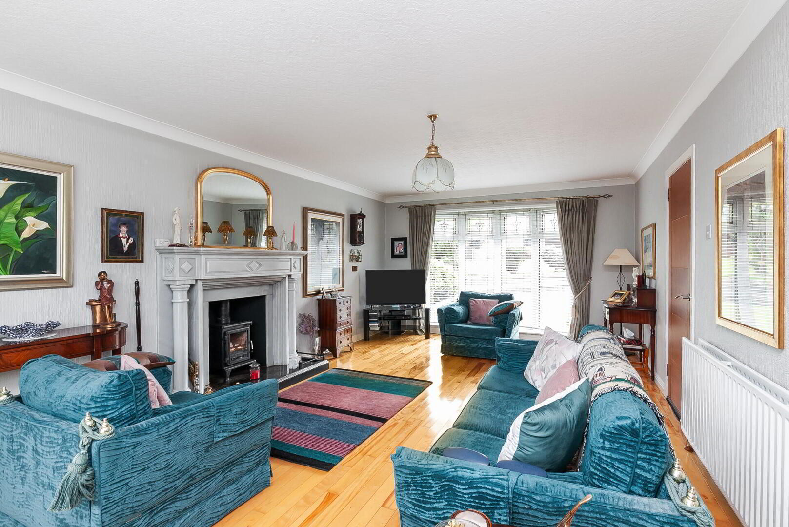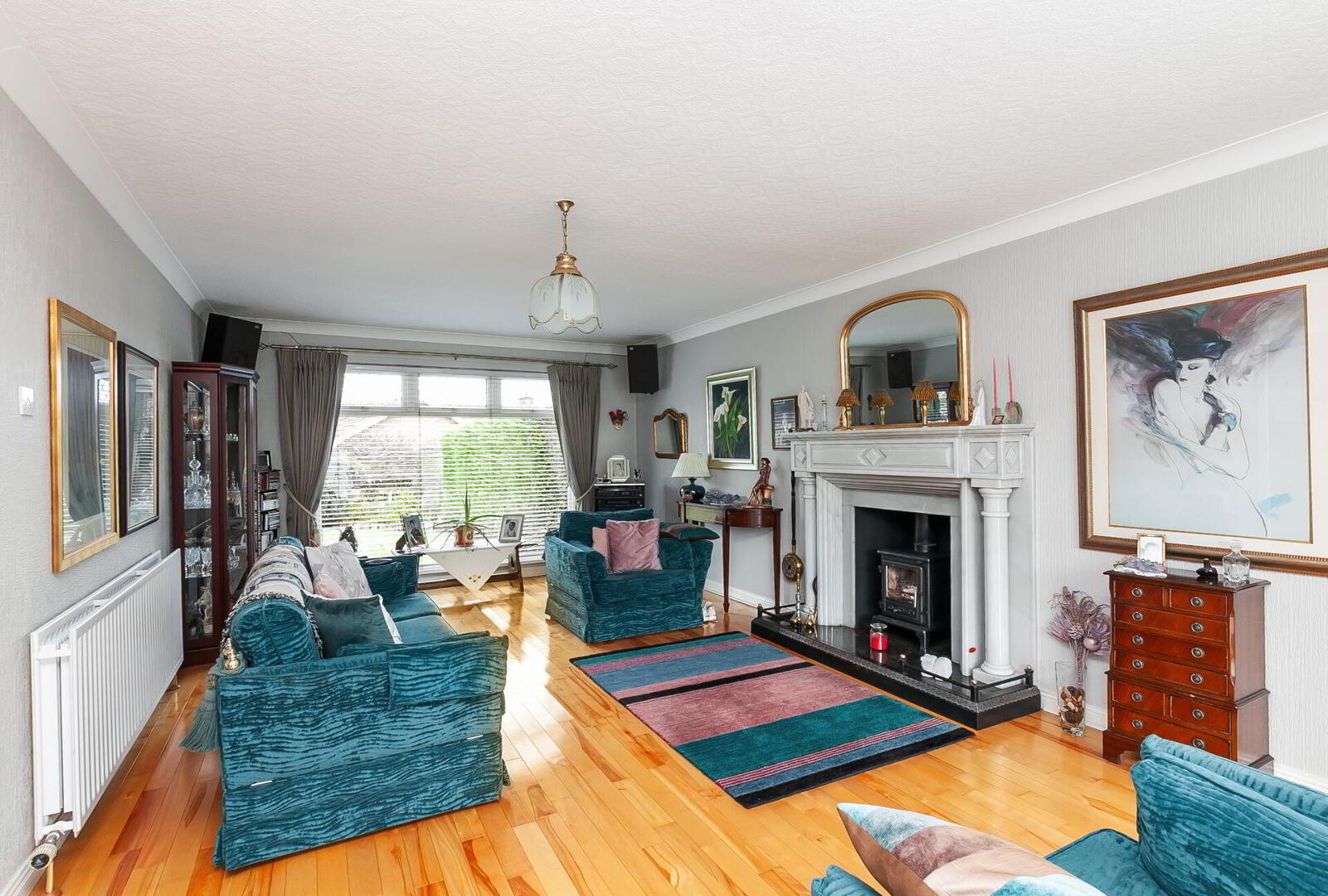 LOUNGE 22' 9" x 12' 8" (6.93m x 3.86m) Wood flooring, feature marble fireplace with cast iron multi fuel burning stove and granite hearth, cornice ceiling.