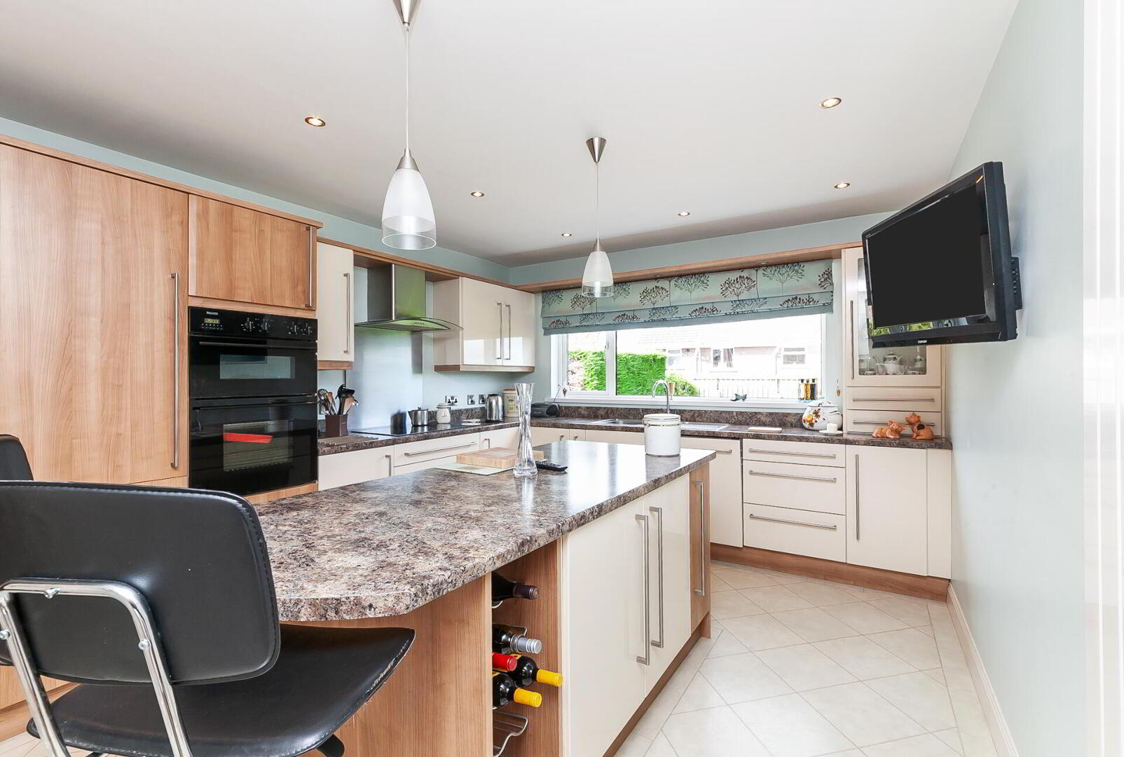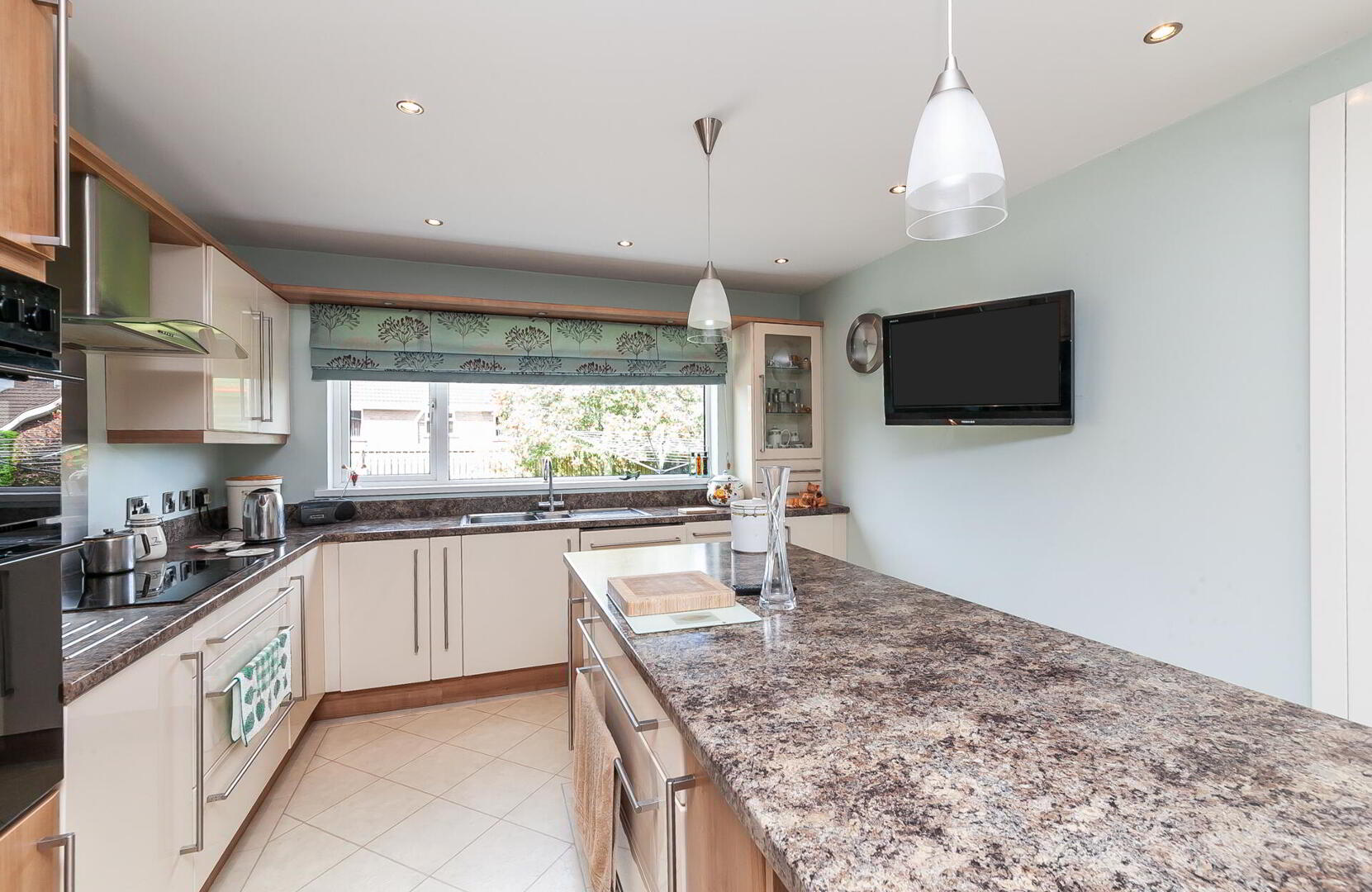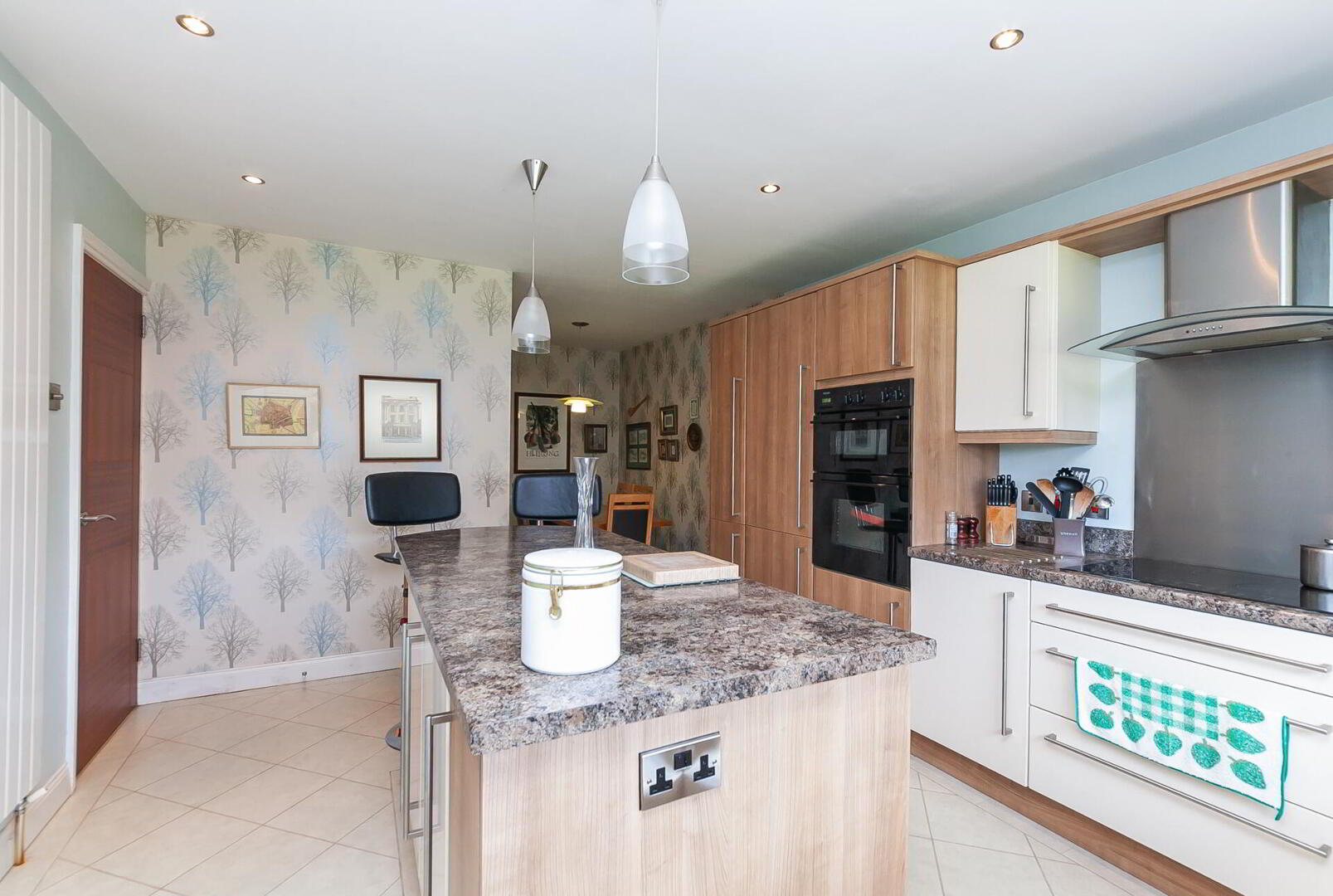 KITCHEN OPEN PLAN TO DINING / FAMILY AREA 23' 2" x 11' 6" (7.06m x 3.51m) (@ widest points) Extensive range of high and low level units, work surfaces with matching splashback, 1.5 bowl single drainer stainless steel sink unit with mixer tap, Belling 5 ring hob with stainless steel splashback and extractor fan, integrated Baumatic electric double oven, integrated Nordmende dishwasher, integrated fridge/freezer, glass display cabinets, low voltage spotlights, island unit with matching work surfaces and breakfast bar.