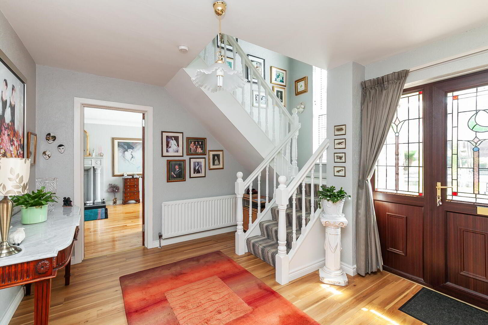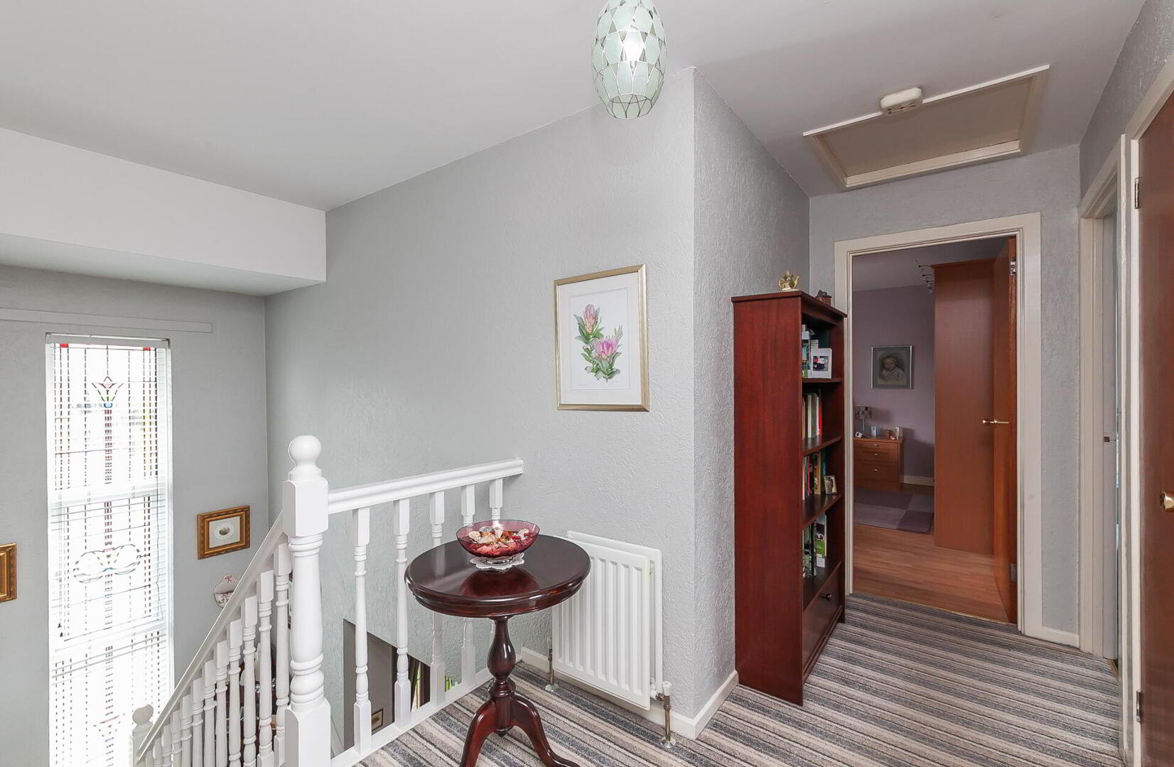 FIRST FLOOR LANDING Access to partially floored roof space, shelved hot press, feature double height stained glass window.