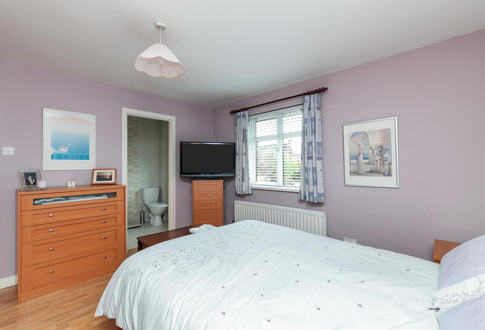 ENSUITE SHOWER ROOM White suite comprising panelled shower cubicle with Aqualisa power shower, pedestal wash hand basin, low flush WC, fully tiled walls, chrome heated towel rail, tiled floor, panelled ceiling with low voltage spotlights.
