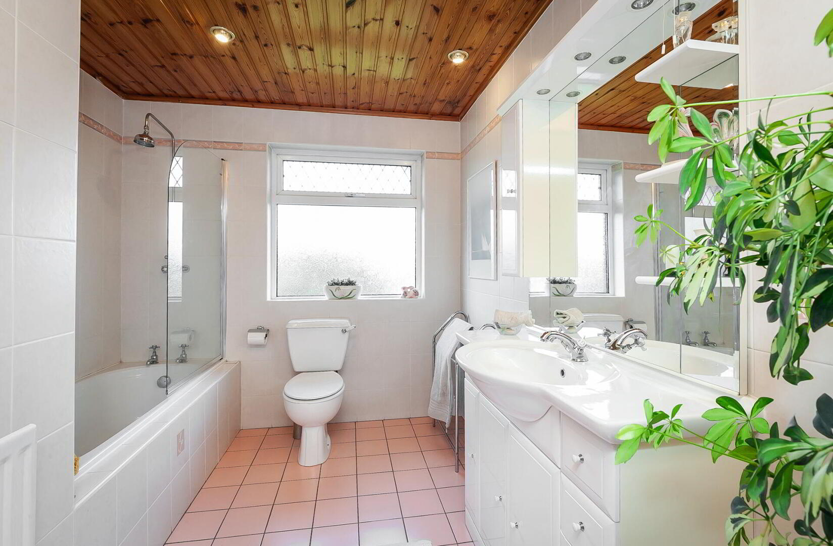 BATHROOM White suite comprising tiled panelled bath with shower over, low flush WC, vanity unit with integrated lighting, shaver point and storage, integrated mirror, fully tiled walls, tiled floor, tongue and groove ceiling with spotlights.