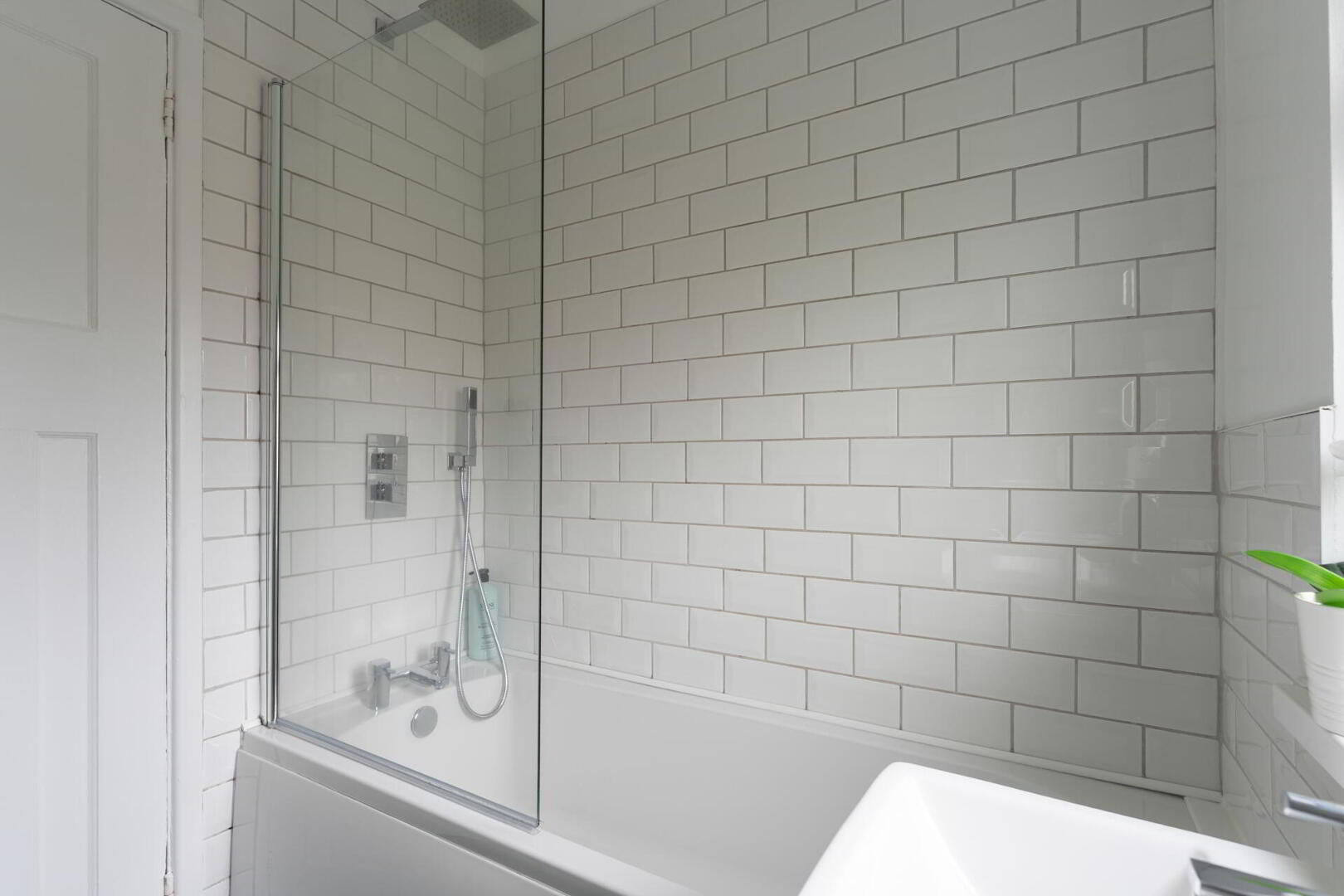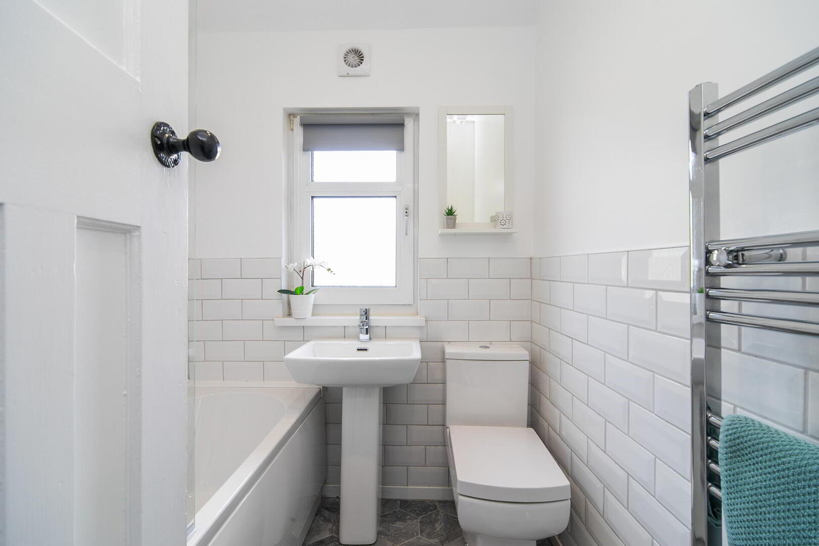 BATHROOM Suite comprising shower bath with Drencher head and hand shower, pedestal wash hand basin, low flush WC, part tiled walls, recessed low voltage spotlights, stainless steel towel radiator, extractor fan.