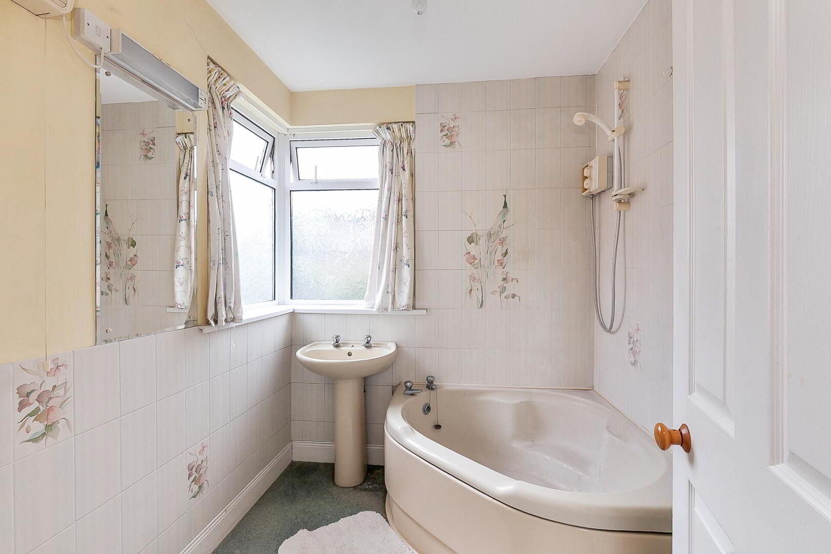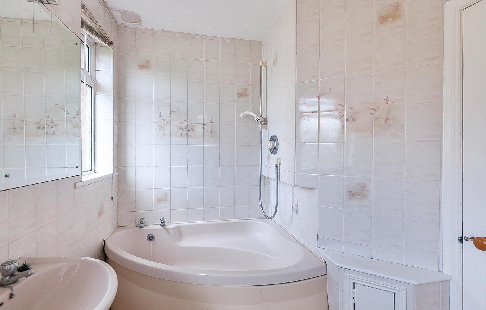ENSUITE Corner bath with shower, pedestal wash hand basin, low flush WC, part tiled walls.