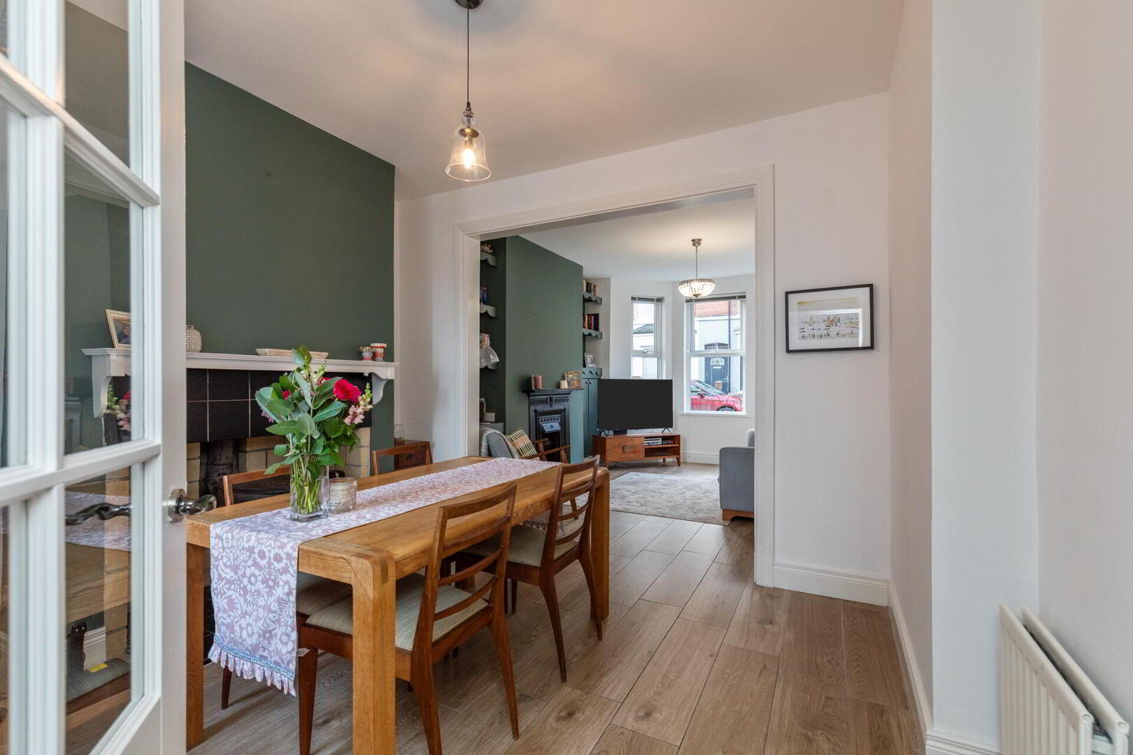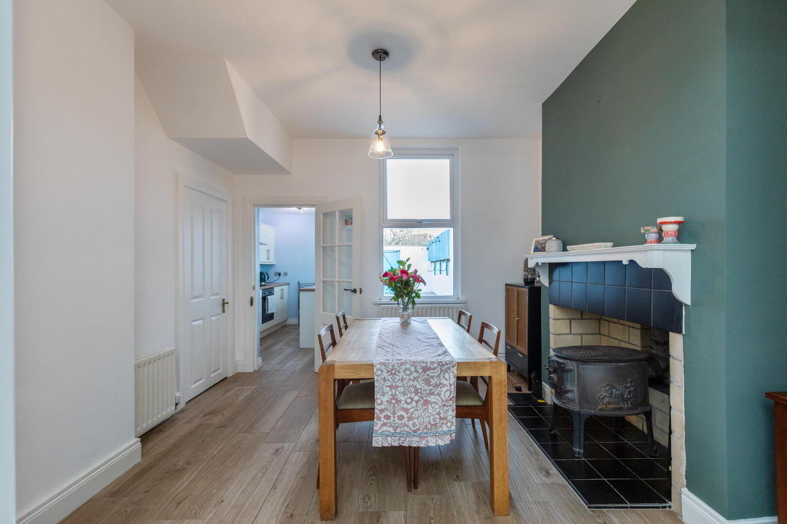 DINING ROOM 11' 7" x 10' 5" (3.54m x 3.19m) Wood effect tiled floor, multi-fuel burning stove with tiled hearth and wooden mantle, under stair storage.