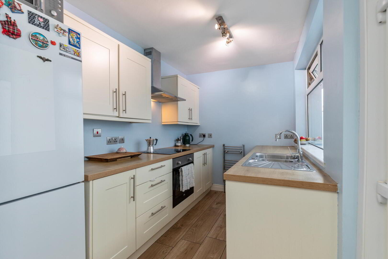 KITCHEN 10' 6" x 6' 7" (3.21m x 2.02m) Excellent range of high and low level units with chrome handles, wood effect work surfaces, stainless steel sink unit, integrated oven and hob with chrome extractor fan over, plumbed for washing machine, space for fridge freezer, heated chrome radiator, wood effect tiled floor.