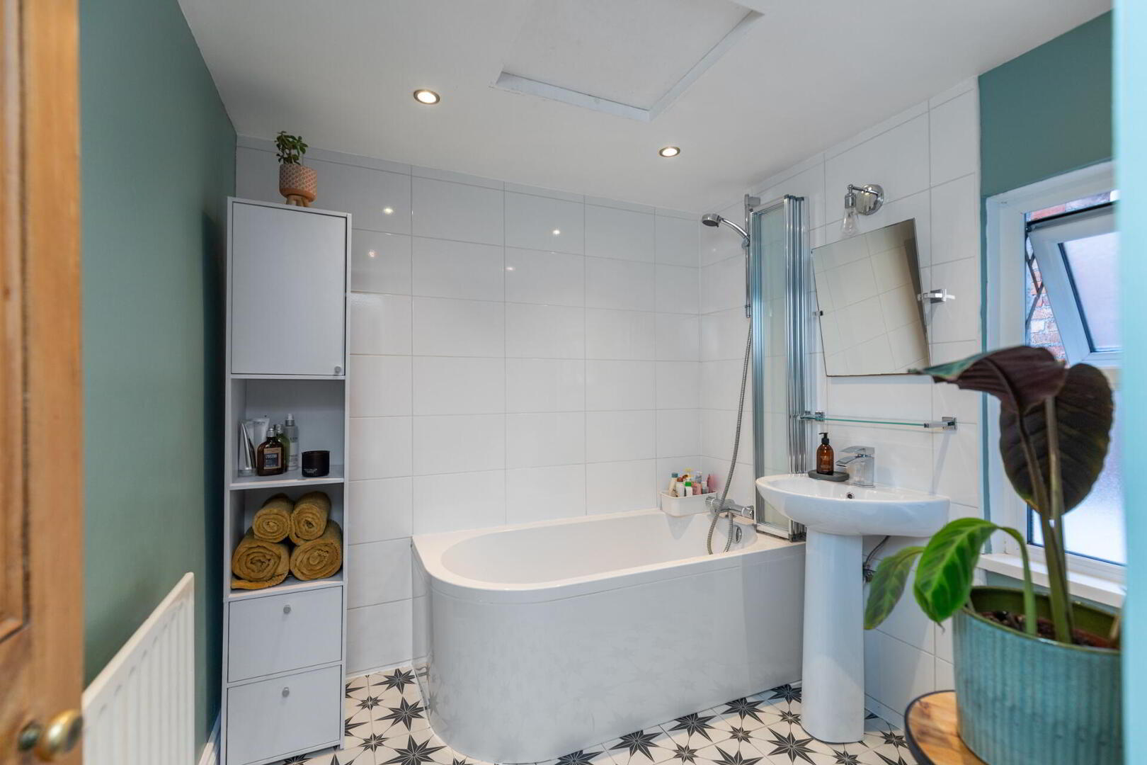 BATHROOM Curved panel bath with chrome taps, pedestal wash hand basin with chrome taps, low flush w.c, tiled floor, partly tiled walls, spot lighting, roof space access.