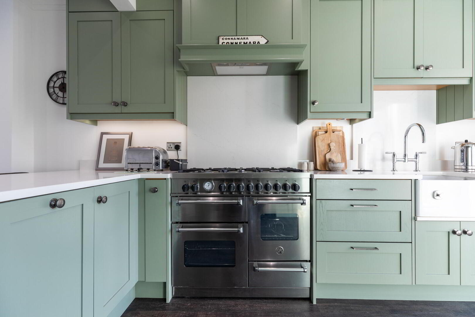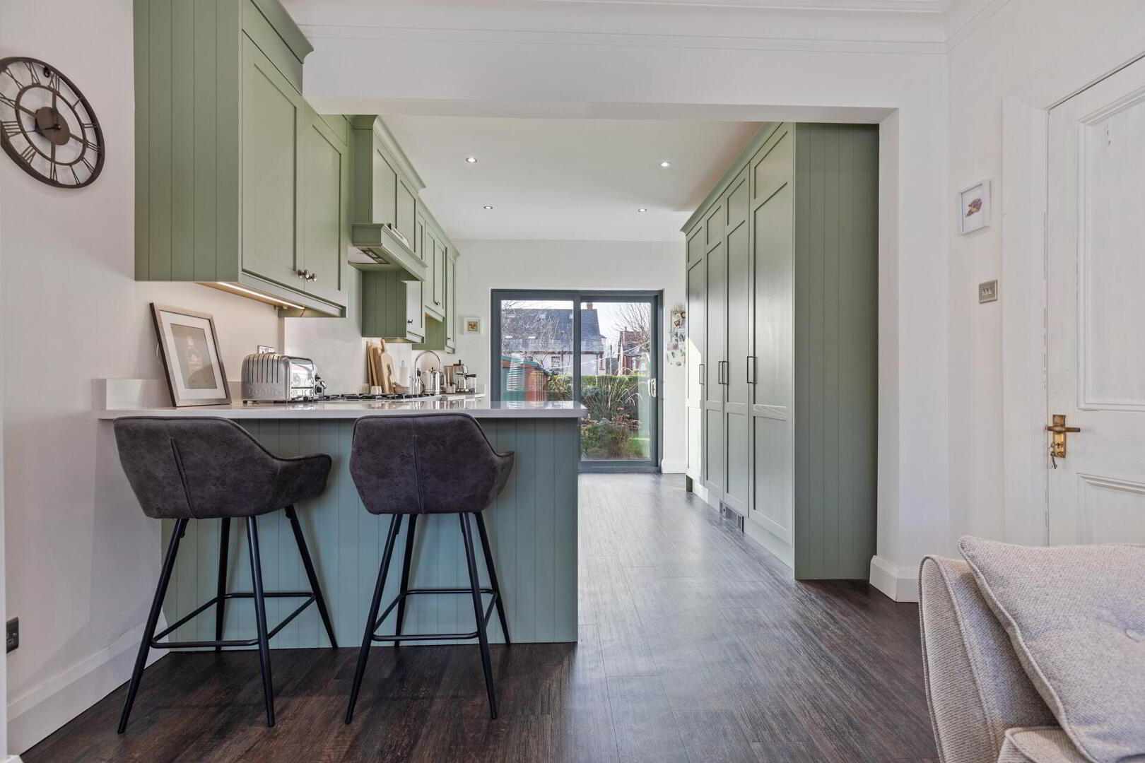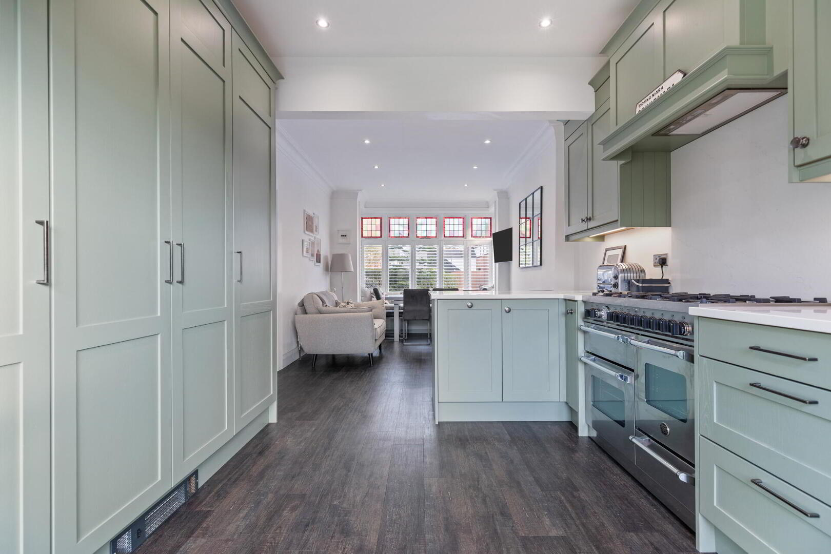 KITCHEN OPEN PLAN TO FAMILY & DINING AREA 27' 9" x 10' 9" (8.46m x 3.28m) (overall @ widest points) Extensive range of high and low level units, granite work surfaces with matching splash back, butlers sink unit with Perrin & Rowe mixer taps, Bertazzoni cooker range, extractor fan over, integrated dishwasher, integrated fridge/freezer, larder cupboard with automatic lighting, concealed under unit lighting, LVT wooden flooring, hole in the wall fireplace with glass fronted stove and slate hearth, cornice ceiling, low voltage spotlights, double glazed sliding doors to rear garden, bay window with feature stained glass insets, window bench seating.