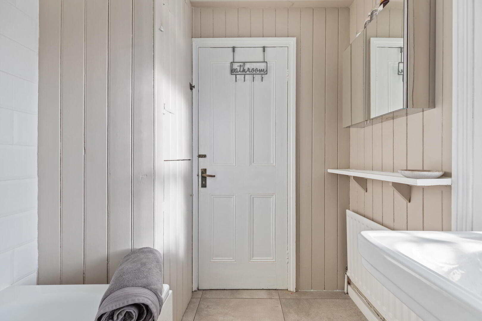 BATHROOM White suite comprising panelled bath with Mira shower over, low flush WC, pedestal wash hand basin, part tiled walls, part tongue and groove walls, tiled floor, tongue and groove ceiling, airing cupboard.