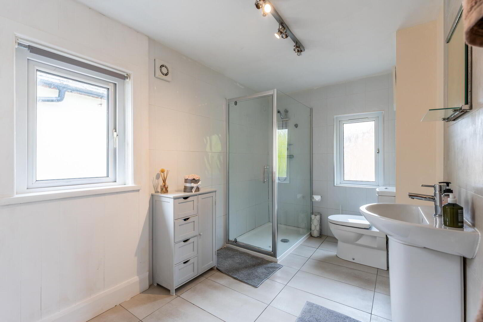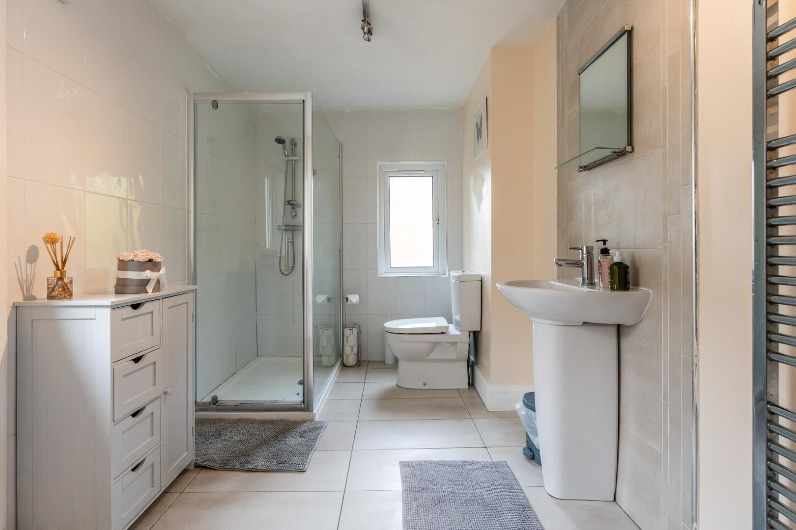 SHOWER ROOM 13' 2" x 6' 8" (4.035m x 2.047m) Large shower enclosure with thermostatic shower unit. Low flush wc. Pedestal wash hand basin with mixer tap. Heated towel radiator and extractor fan. Hot press. Part tiled walls and tiled floor.