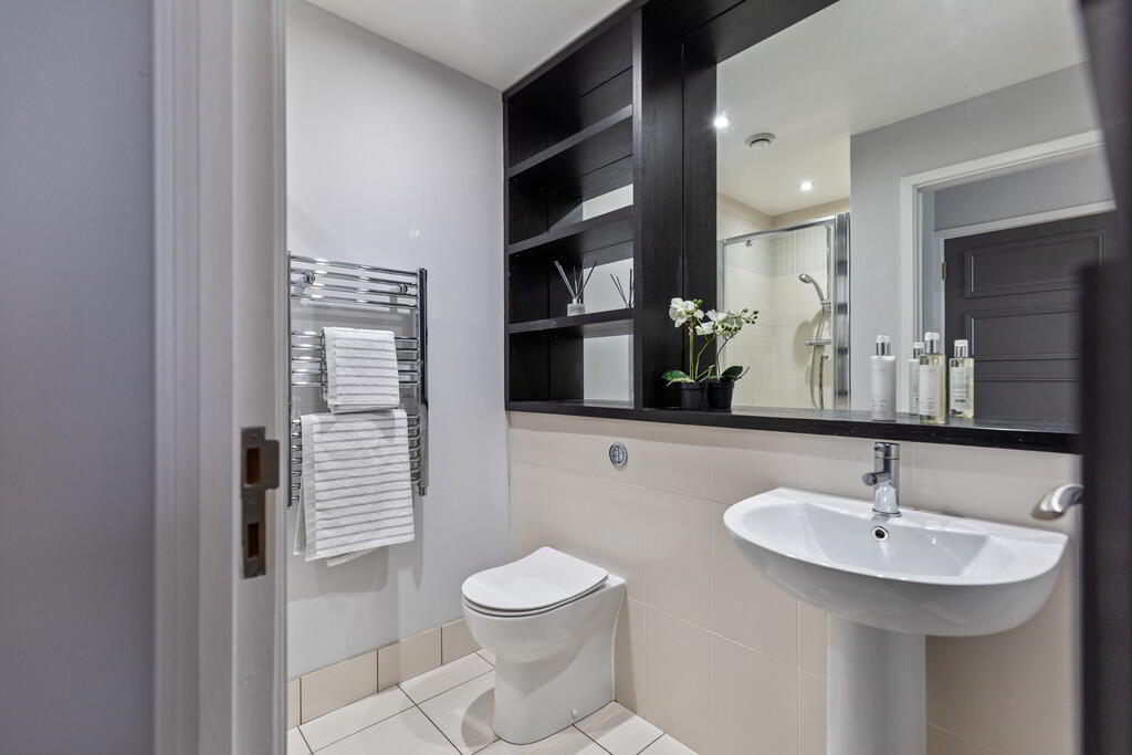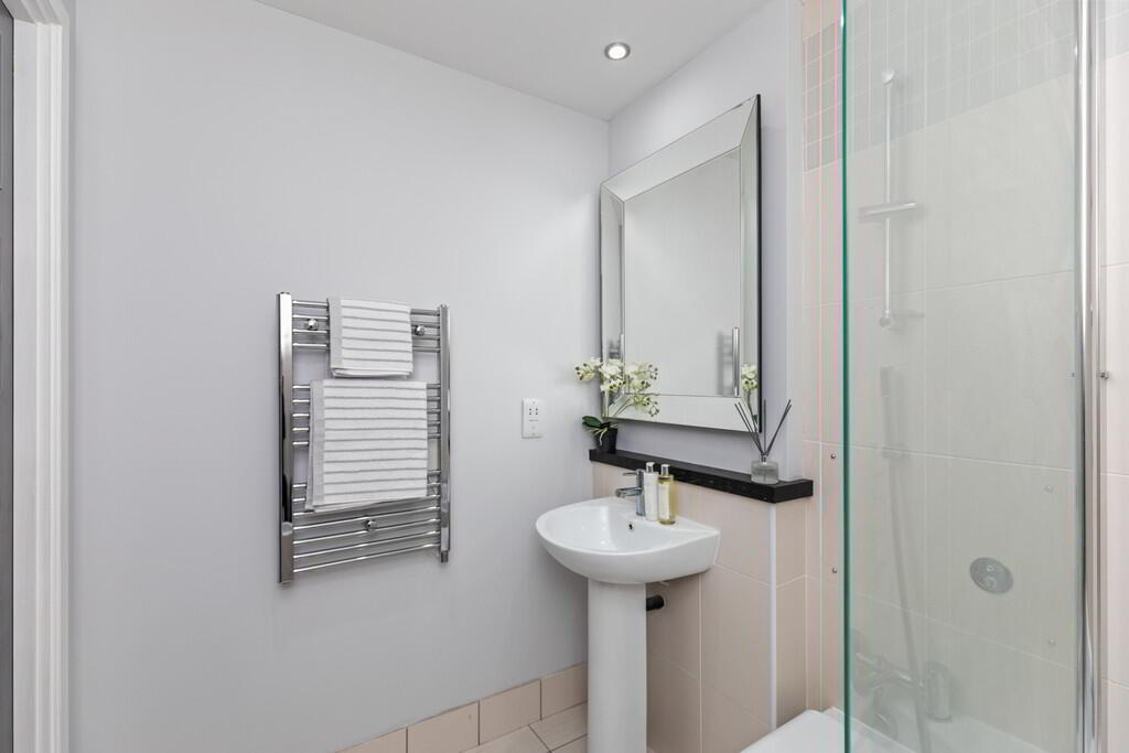 ENSUITE Modern white suite comprising of an enclosed shower cubicle, low flush wc with concealed cistern, pedestal wash hand basin, tiled floor, part tiled walls, stainless steel towel radiator, recessed low voltage spotlights.