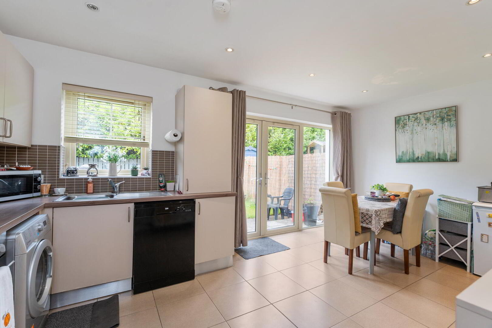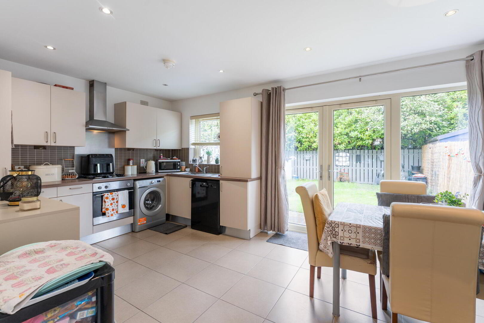 KITCHEN WITH DINING AREA 17' 8" x 10' 9" (5.40m x 3.30m) Excellent range of high and low level units with chrome handles, feature under lighting, wood effect work surfaces, integrated oven and four ring gas hob with chrome extractor fan over, stainless steel sink unit, plumbed for washing machine, plumbed for dishwasher, integrated fridge freezer, tiled floor, partly tiled walls, spot lighting, double doors to rear garden.
