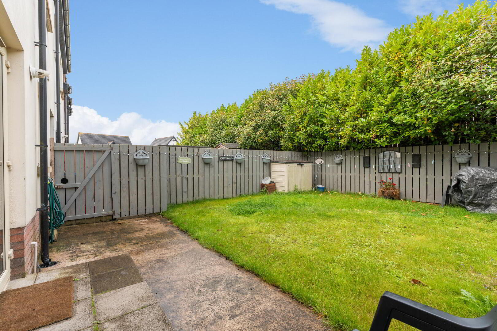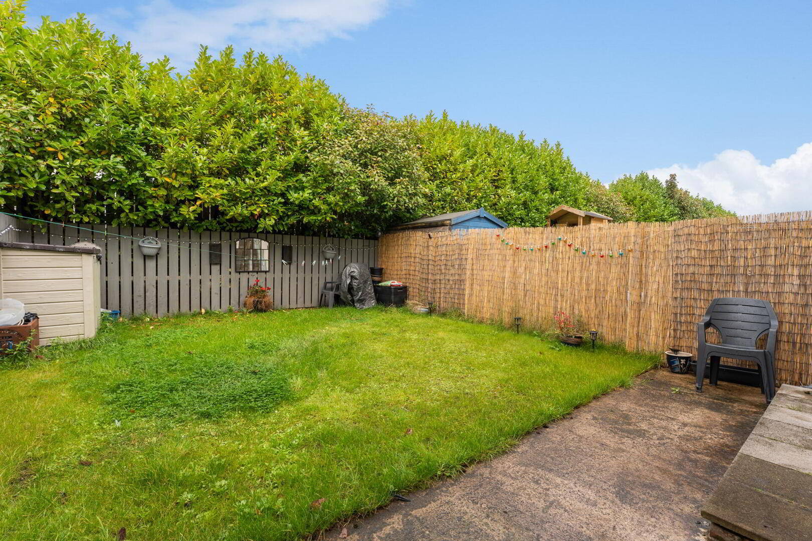 OUTSIDE Private, enclosed rear garden laid in lawn with timber fencing.