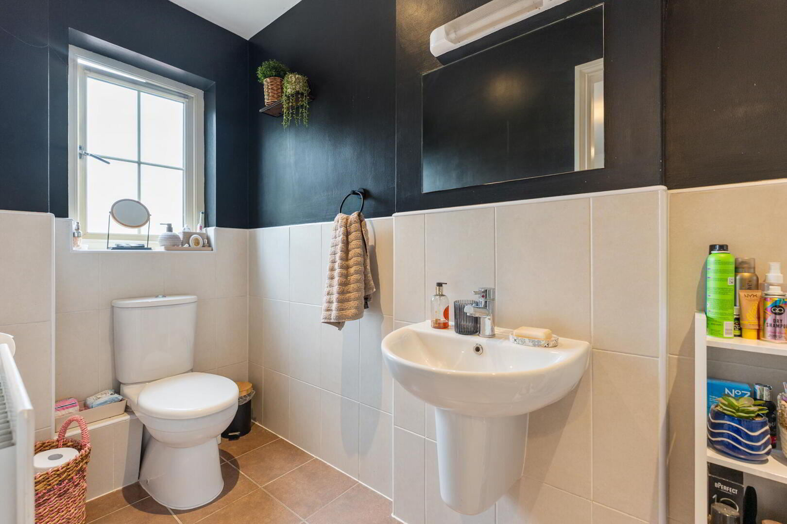 DOWNSTAIRS W.C Low flush w.c, wall hung wash hand basin with chrome taps and storage under, tiled floor, spot lighting.
