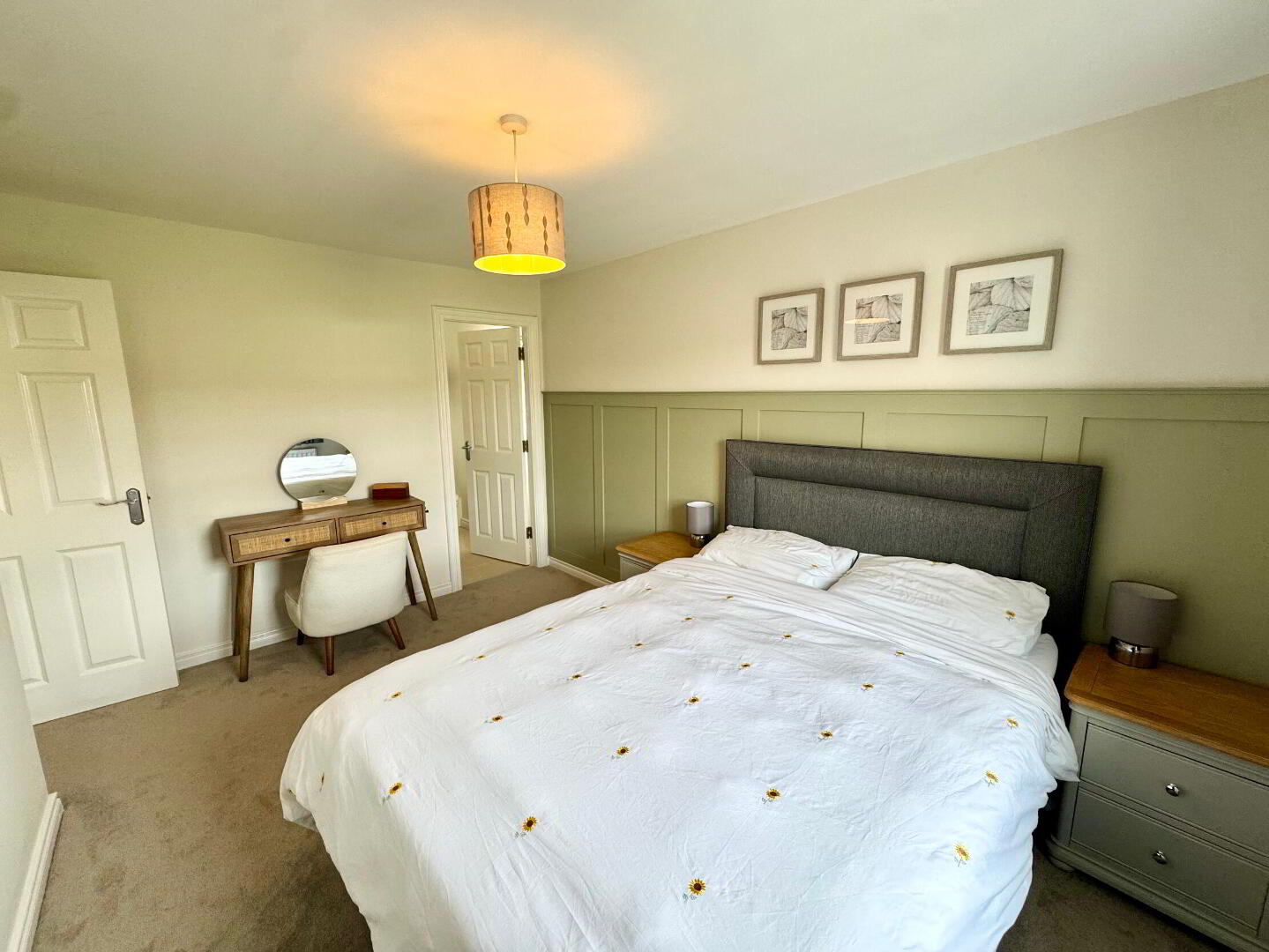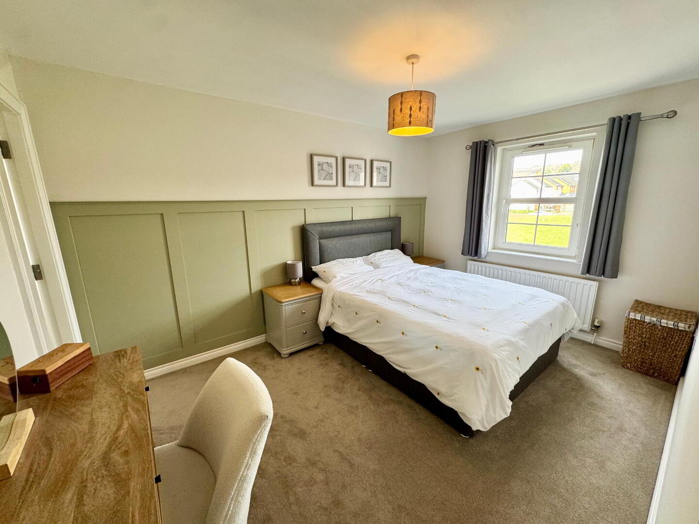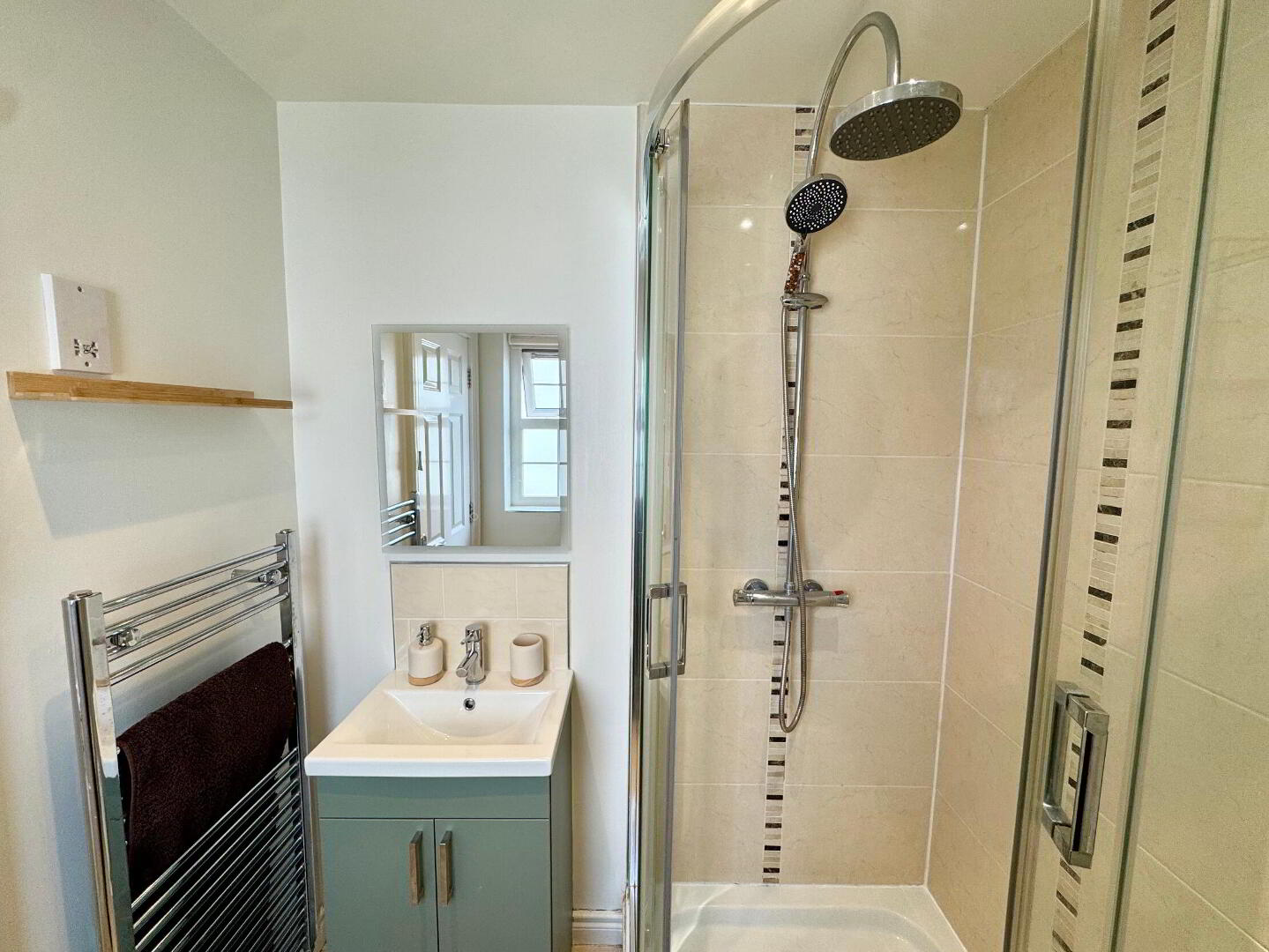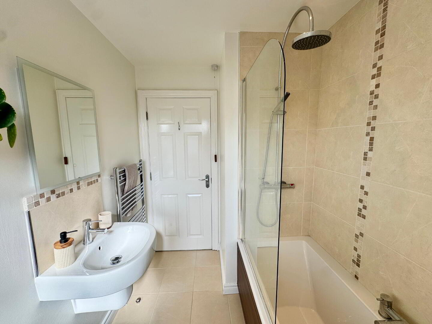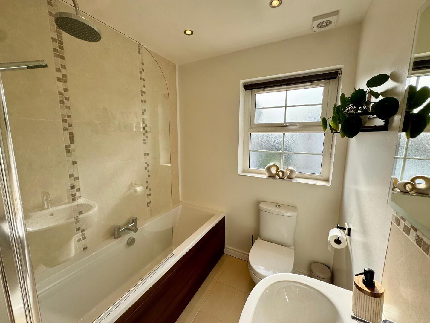 Upstairs, the property offers a generously sized master bedroom with ensuite shower room, a second double bedroom, and a third bedroom. The family bathroom is fitted with a shower over the bath.