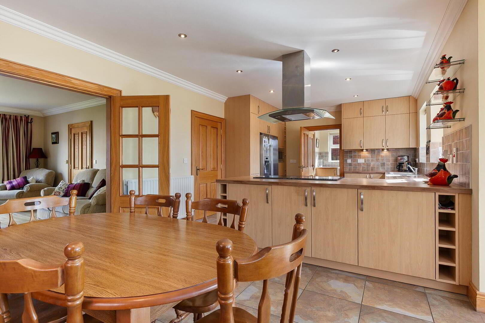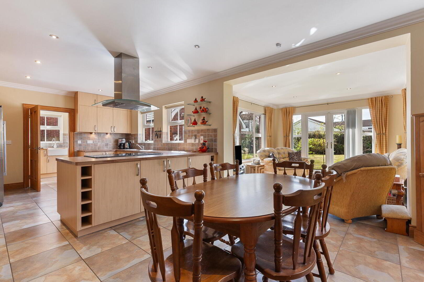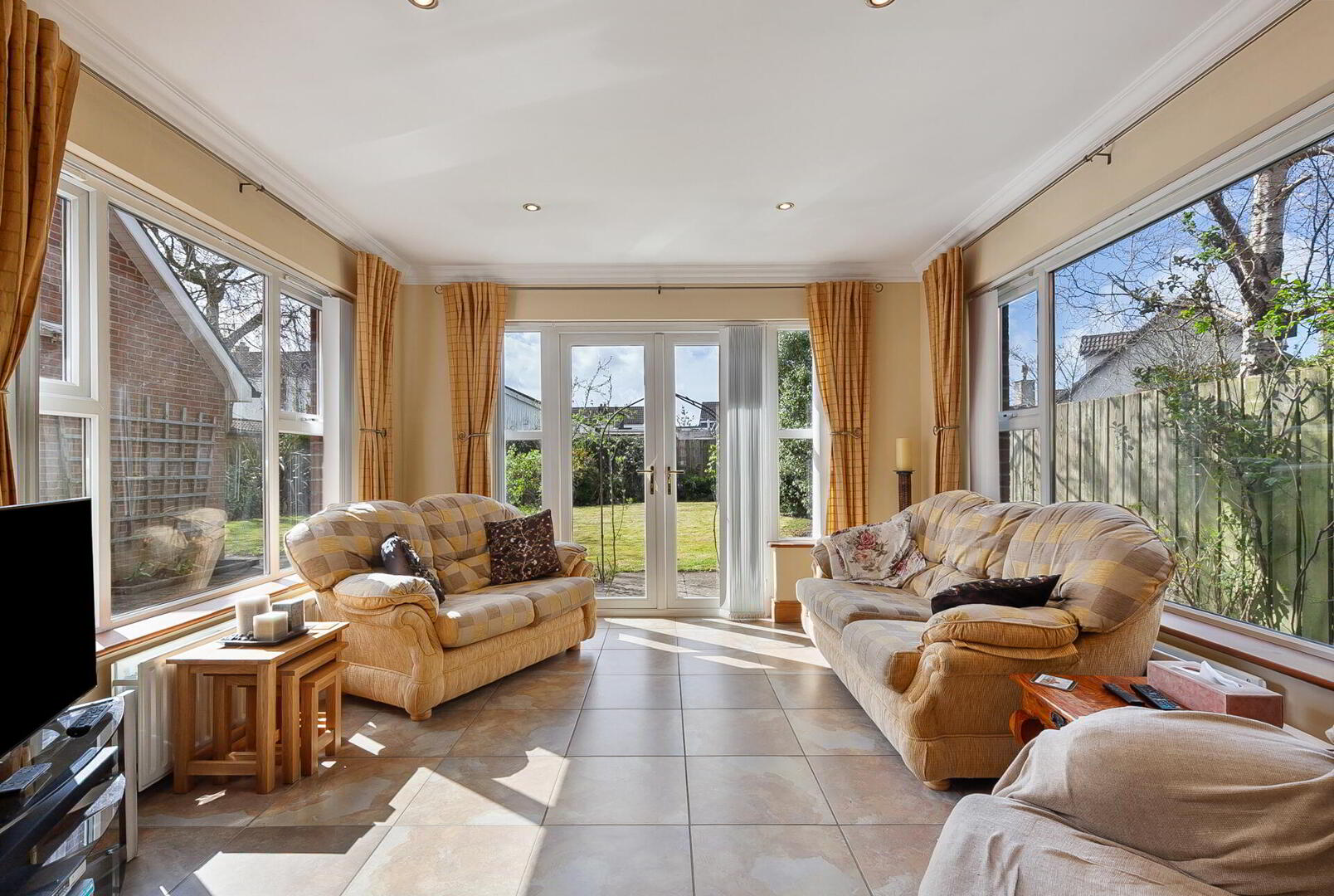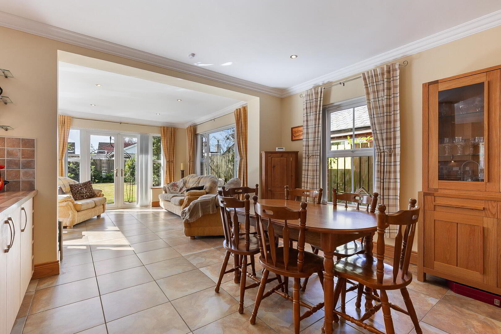 OPEN ARCH TO SUN ROOM 11' 11" x 11' 10" (3.63m x 3.61m) Matching tiled floor, cornice ceiling, low voltage spotlights, uPVC double glazed patio doors to rear.