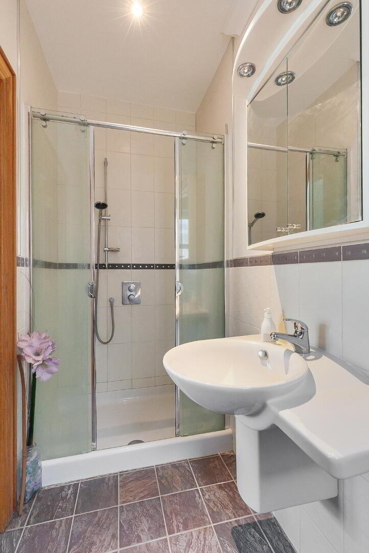 ENSUITE SHOWER ROOM White suite comprising half pedestal wash hand basin, low flush WC, fully tiled shower cubicle, chrome heated towel rail, part tiled walls, tiled floor, cornice ceiling, low voltage spotlights.