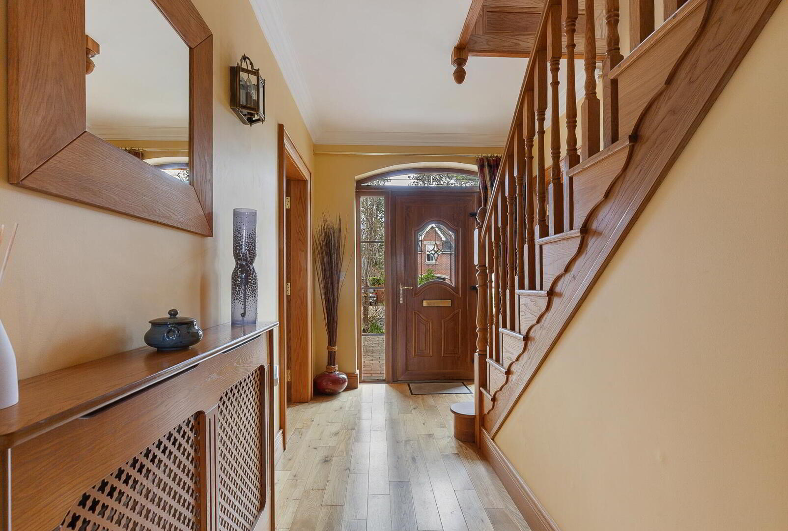Oak effect uPVC double glazed front door with double glazed side windows to reception hall.