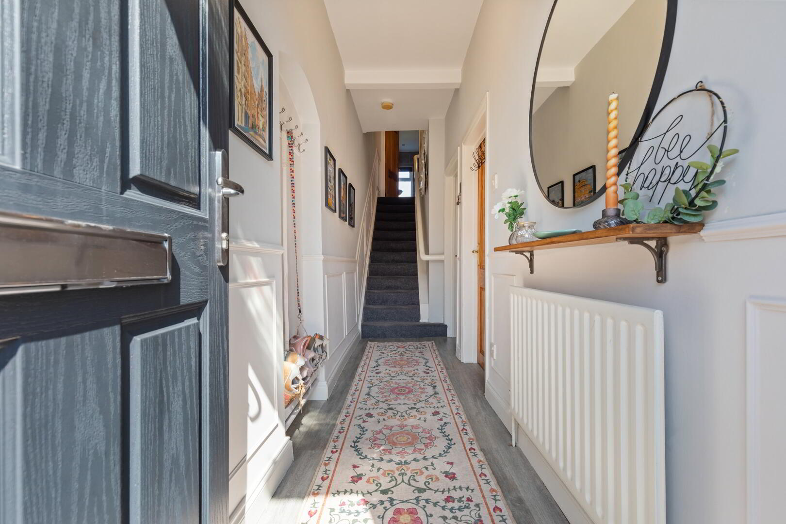 ENTRANCE HALL Composite front door with fan light, partially wood panelled walls.