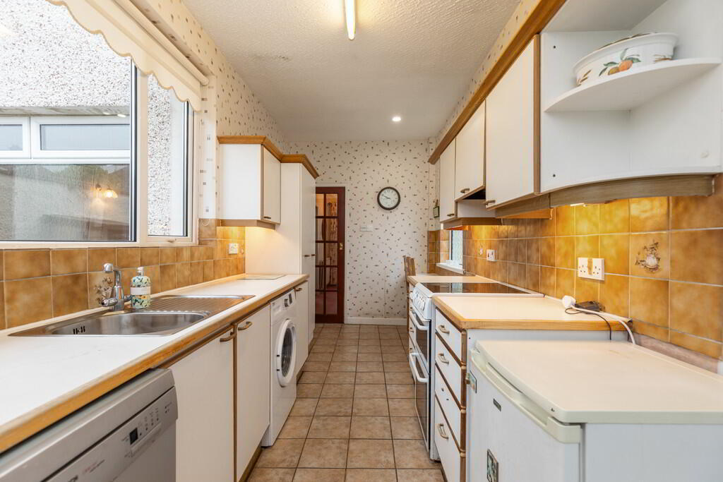 KITCHEN WITH BREAKFAST AREA 17' 7" x 6' 8" (5.37m x 2.05m) Range of high and low level units with formica work surfaces, stainless steel sink unit, space for oven and hob, space for fridge, plumbed for dishwasher, plumbed for washing machine, breakfast bar, tiled floor, partly tiled walls, spot lighting.