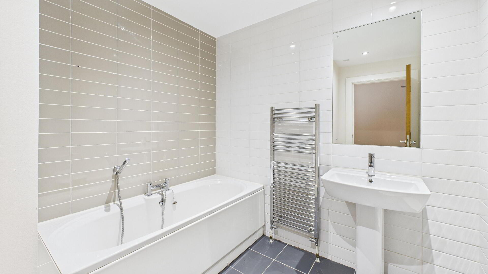BATHROOM Suite comprising panelled bath with telephone hand shower; pedestal wash hand basin; dual flush WC; tile floor and walls; heated towel rail.