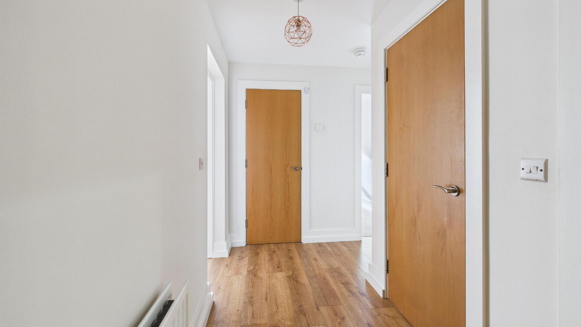 ENTRANCE HALL Built-in cupboard with gas boiler; wood laminate floor; double panel radiator.