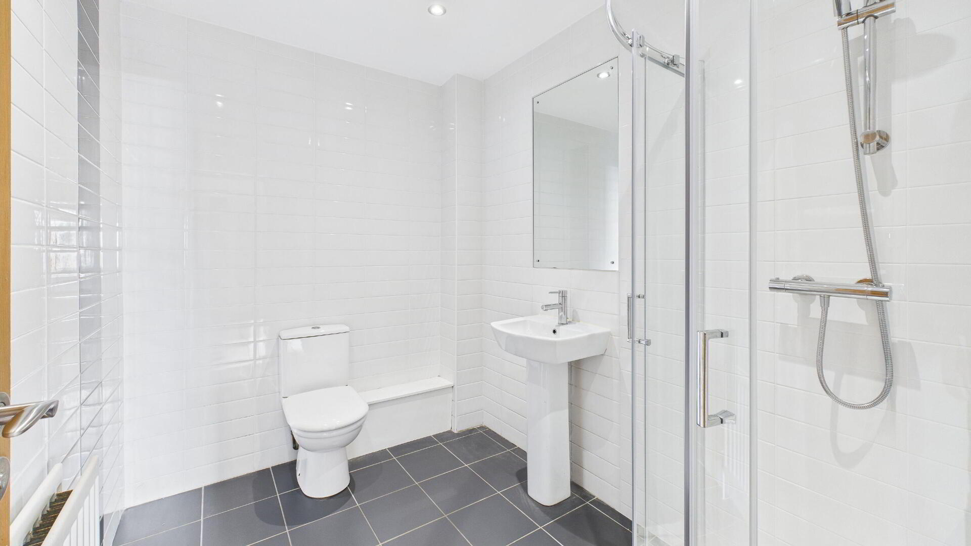 EN SUITE SHOWER ROOM Suite comprising a corner shower enclosure with thermostatic shower; dual flush WC; pedestal wash hand basin; double panel radiator; tile floor and walls.