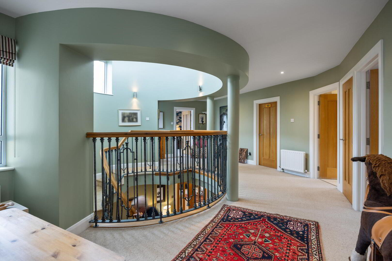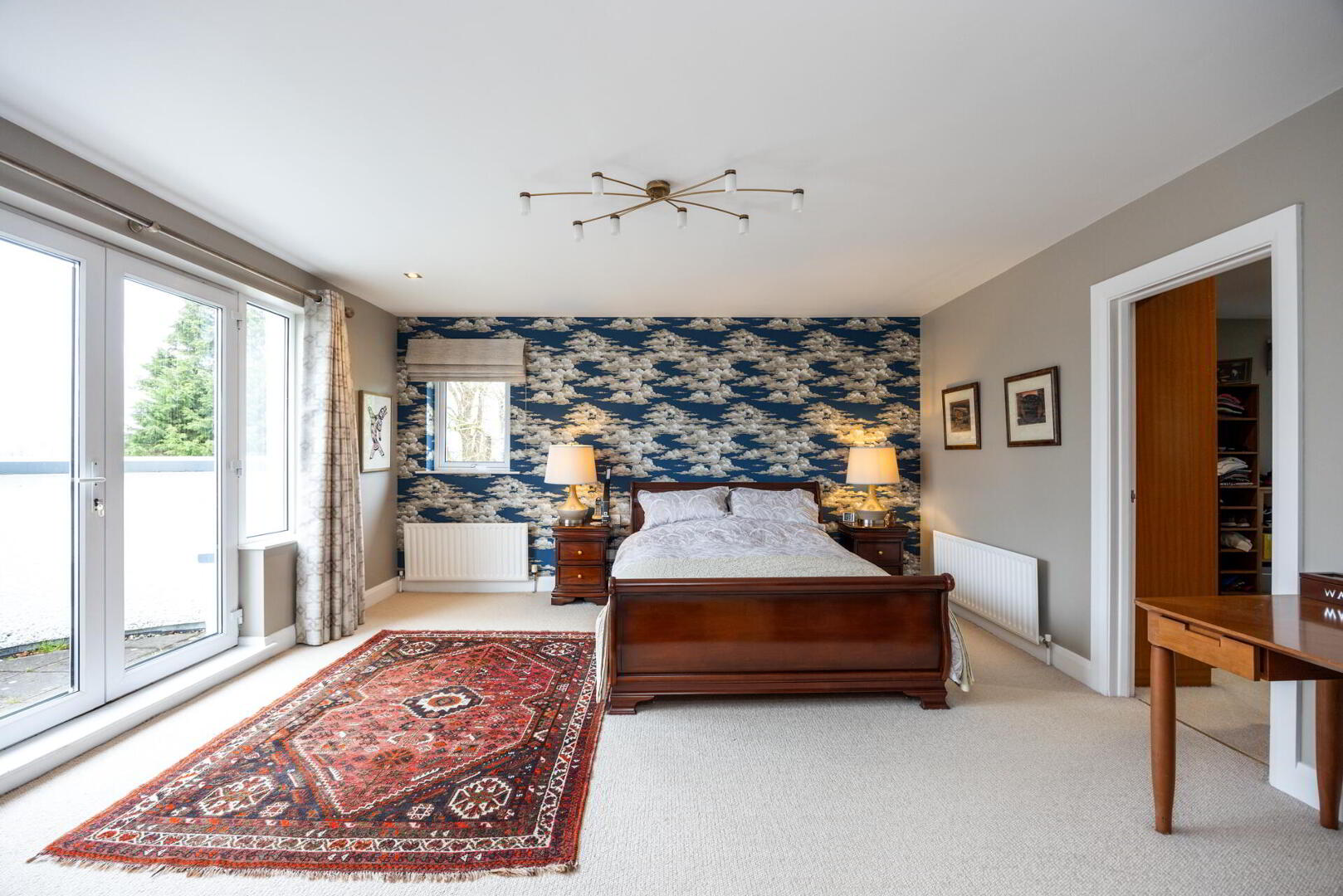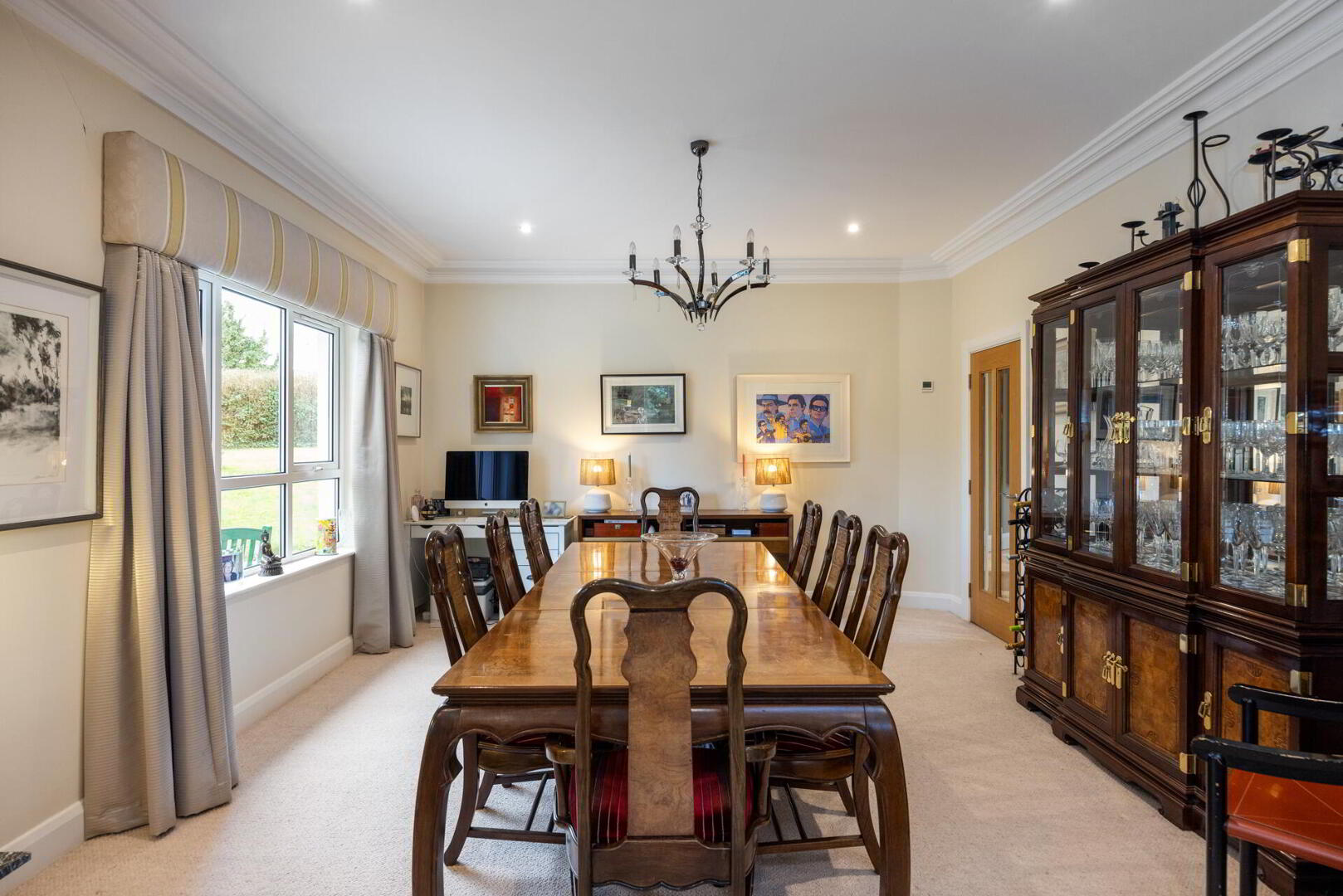Internally the thoughtfully laid out accommodation emanates from the central feature circular staircase. On the ground floor is the drawing room, which opens to formal dining room, lounge, open plan kitchen with living and dining area, utility room and cloakroom with wc. The first floor accommodation comprises of four very well proportioned bedrooms and the family bathroom. The principal bedroom features a dressing room and walk in wardrobe, ensuite shower room and a balcony. The guest bedroom also has an ensuite shower room and walk in wardrobe along with a covered balcony area.